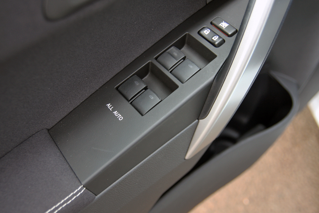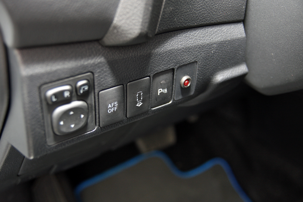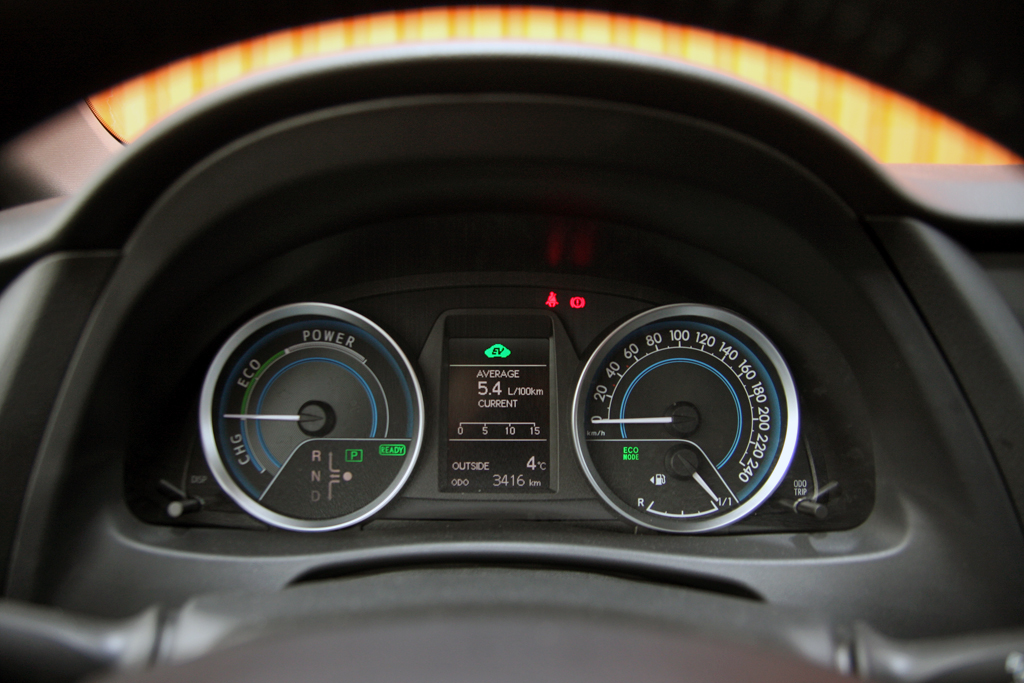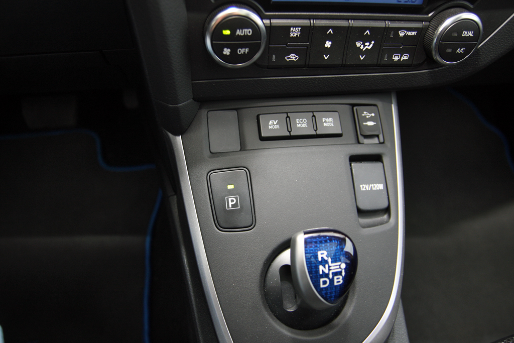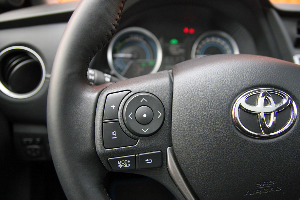 A váltó fölött választhatóak az üzemmódok, a kormánytól balra található a kanyarfény és az automata parkolási rendszer kapcsolója. Utóbbi megnyomása után a radarok helyet keresnek a bal vagy a jobb oldalon attól függően, merre indexelünk, majd párhuzamosan egész ügyesen bekanyarintja az Aurist. A kiállásban nem segít…