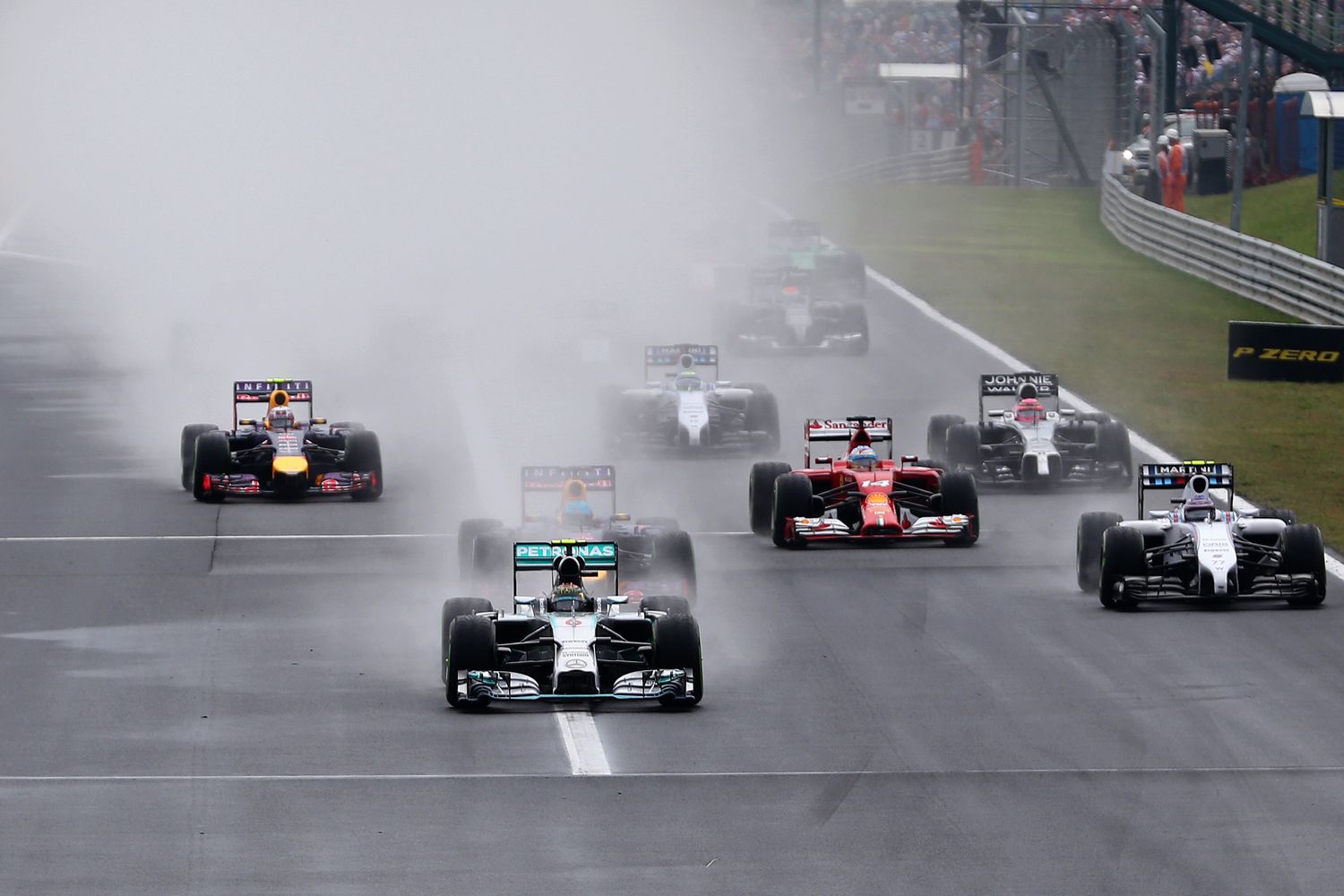 Felhőszakadás után száradó Hungaroringen kezdődött a 29. Forma-1-es Magyar Nagydíj. A mezőny intermediate gumikon vágott neki a 70 körös versenynek. Hamilton szombaton kiégő autóján kb. mindent kicseréltek, s a bokszutcából startolhatott, akárcsak az időmérőn balesetező Magnussen és a motorhibával a rajtrácson ragadt Kvjat is. A pole-ból Rosberg indult, mellőle Vettel, mögülük Bottas, Ricciardo, Alonso és Massa. Räikkönen csak a 17. kockából pályázhatott néhány pontocskára.