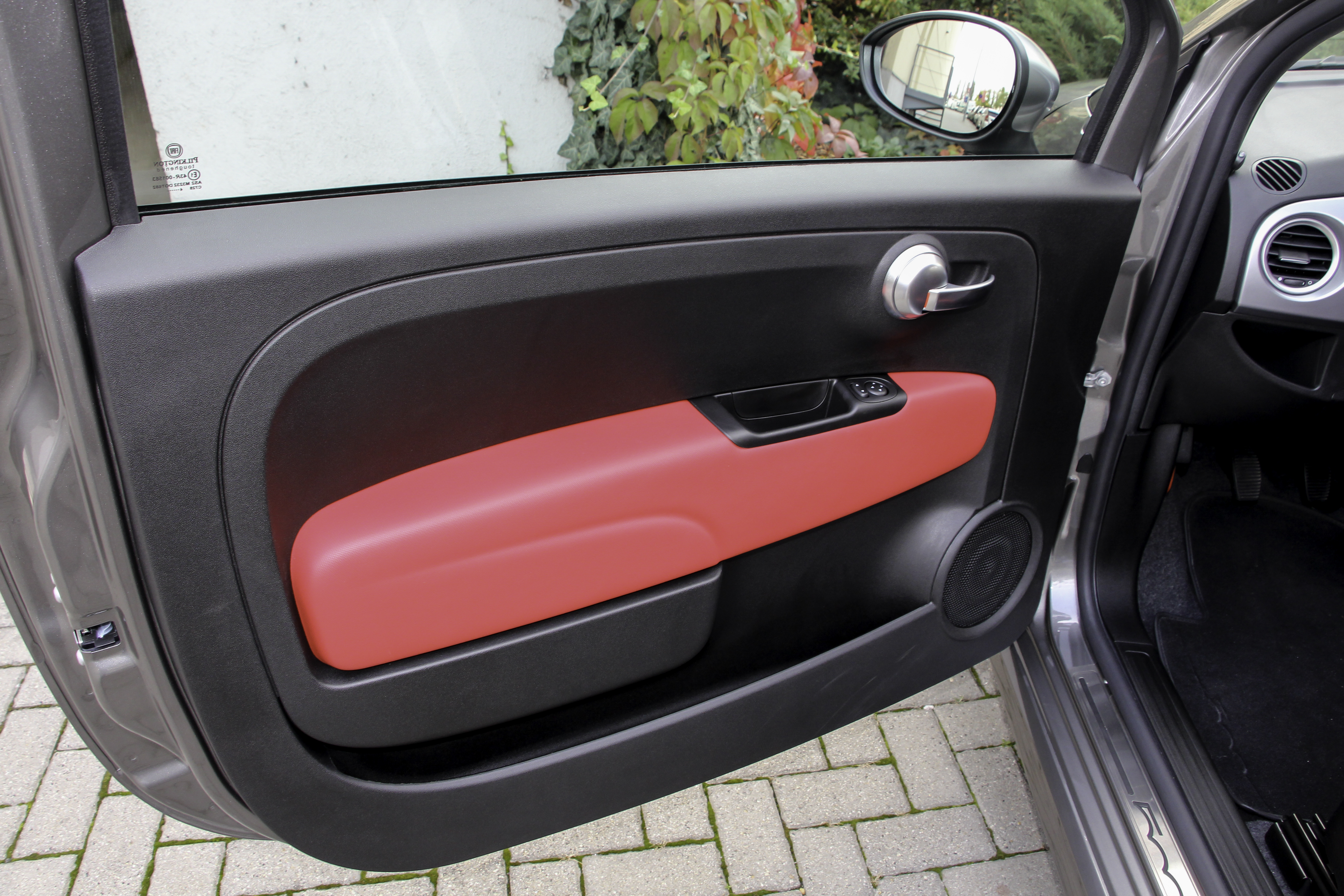Szigorúan négyüléses, hátul apró, elöl tágas az utastér, 500S nyomásúak a háttámlák, az ülésekre rímelően piros betétesek az ajtók