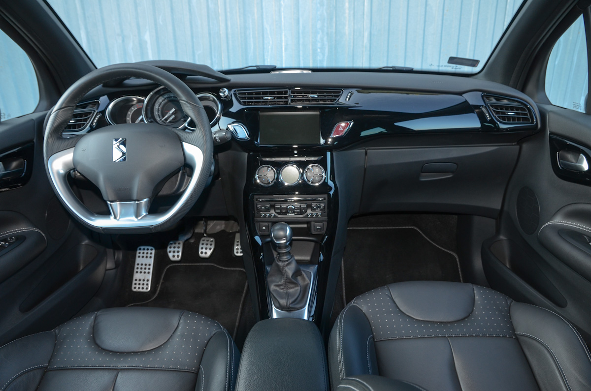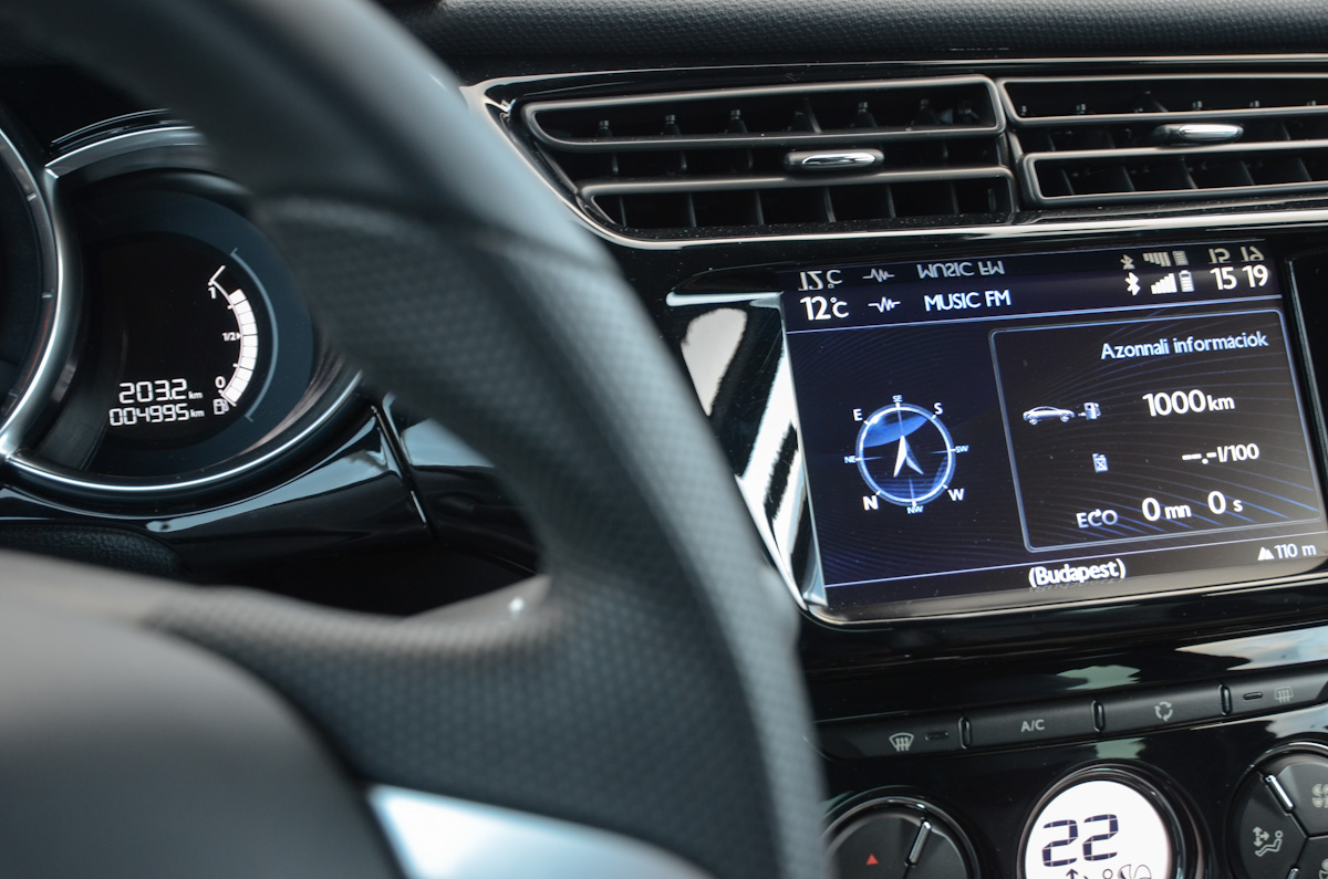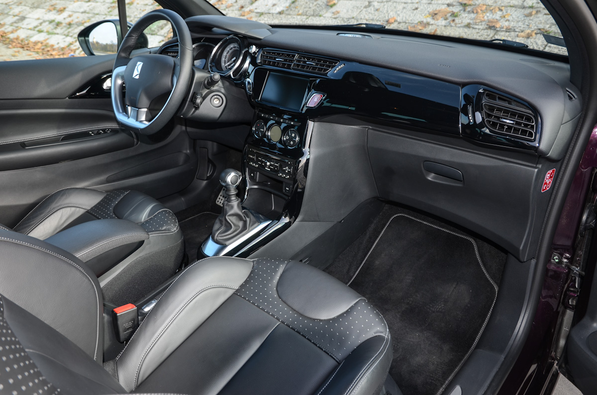 Sportos belső. Az ajtót kinyitva különös látvány tárul elénk. A bőr sportülések olyan brutálisak, mint valami vérbeli sportautóban. Kinézetükkel azonnal arra csábítanak, hogy pattanjunk be, és nézzük meg mennyire fekszi az utat a DS 3, valóban szükség van-e ilyen ülésekre és versenyautós hangulatot idéző fémpedálokra? A vezetési pozíció kényelmes, ez részben a mélységben és magasságban is állítható kormánynak köszönhető. Teljesen magamra szabva az ülés- és kormánypozíciót, egyetlen zavaró dolog adódott: a kormány felső része kitakarta a műszerfal számlapjának felső részét, amely nagyjából a 90-140 km/h sebességintervallumot fedte le. Ez viszont egyáltalán nem a DS 3 hibája, a legtöbb autóban előfordul ez nálam. A fényes fekete műszerfalbetétek jól mutatnak. Annak ellenére, hogy a teljes belső színvilág sötét – kivéve a kormány és váltó alatti ezüst berakásokat – nem uralkodik komor hangulat az utastérben. Az anyaghasználat prémiumos: a kormány finom, puha bőrözésű, ugyanez jellemző a bőrkárpitra is. A műszerfal felső része ránézésre olyan, mintha valamilyen durvább szövetből lenne, fogásra viszont kiderül: műanyag. Ez egyáltalán nem hátrány, összességében sokkal jobb megjelenést kölcsönöz, mintha csak sima, fapados plasztikból lenne. A belsőnek egyetlen hátránya van: hátul egy 180 cm magasságú vezető mögött felnőtt ember részére kevés hely marad.