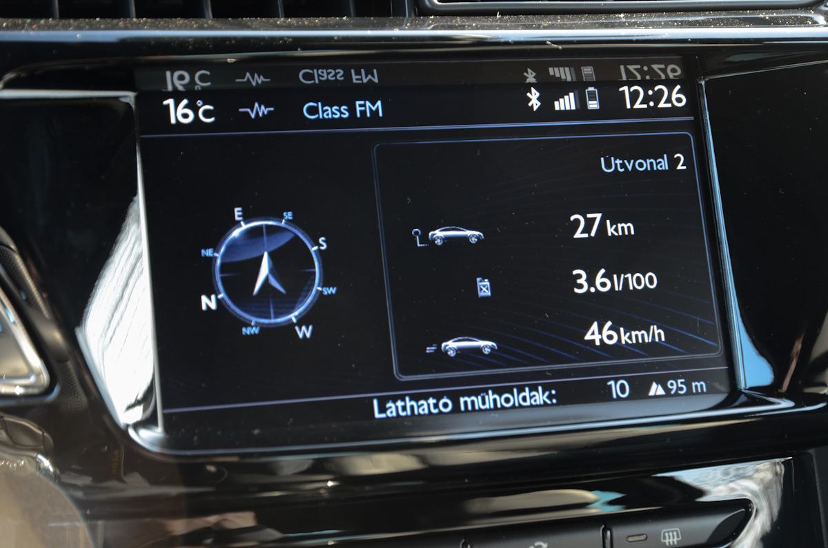 Szuper BlueHDi. Az utastér jó szigetelésének köszönhetően hidegen sem hangos az 1,6 literes blokk, melegen pedig még jobban elcsendesül. Menet közben gázadáskor kellemesen morog a 4 henger, jobban odalépve pedig kb. 1800 1/perces fordulattól jön a hirtelen hátba vágó gyorsulás. 3000-3500-as fordulat felett már kezd elfogyni az erő és csak az egyre erősödő motorhang marad. A váltó 6 fokozatú manuális, az áttételezése nagyszerű, emiatt a fogyasztás is nagyon barátian alakul, melyhez a gyors, különálló önindító helyett a generátorral és a motor szíjas berántásával dolgozó start/stop rendszer is nagyban hozzájárul. Az első utam a városon keresztül vezetett, pont az esti csúcsforgalomban. A folyamatos araszolás ellenére sikerült 5,5 l/100 km-rel hazaérni, innentől kezdve pedig folyamatosan esett az átlag a teszt során. Egy nyugodt, szombati délután városi, elővárosi és némi országúti higgadt tempós autózáskor sikerült a gyári, 3,6 l/100 km fogyasztással teljesítenem egy utat. A pillanatnyi fogyasztások 1500-as fordulatszámon az alábbi táblázatban láthatóan alakultak. A teszt során fele-fele arányban oszlott el a városi és az országúti használat, a fogyasztás végül 4,5 l/100 km-re adódott.