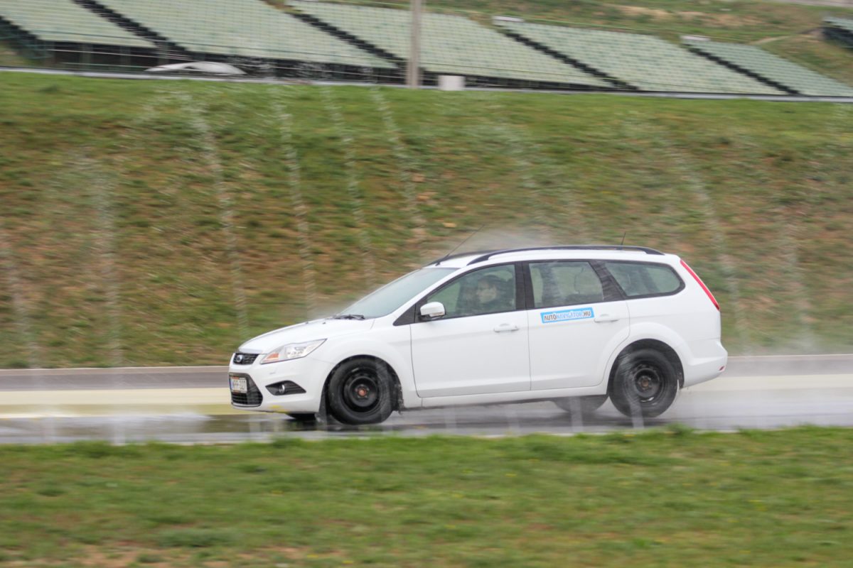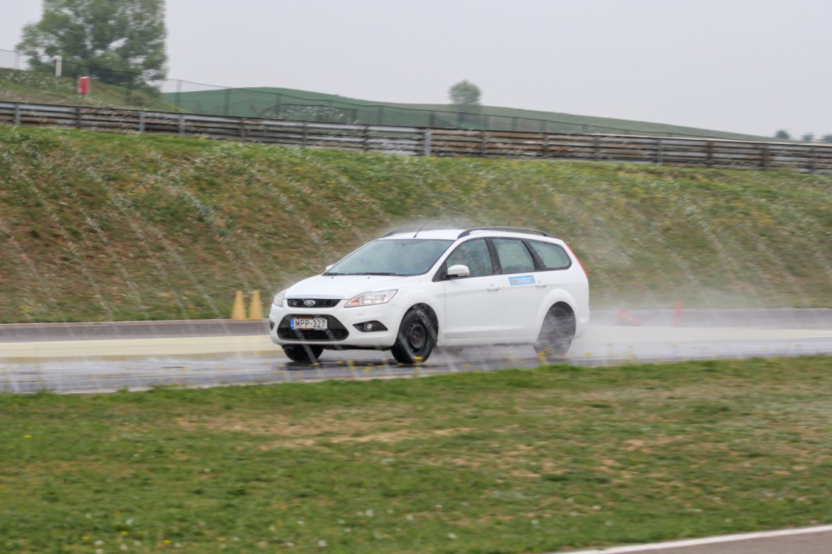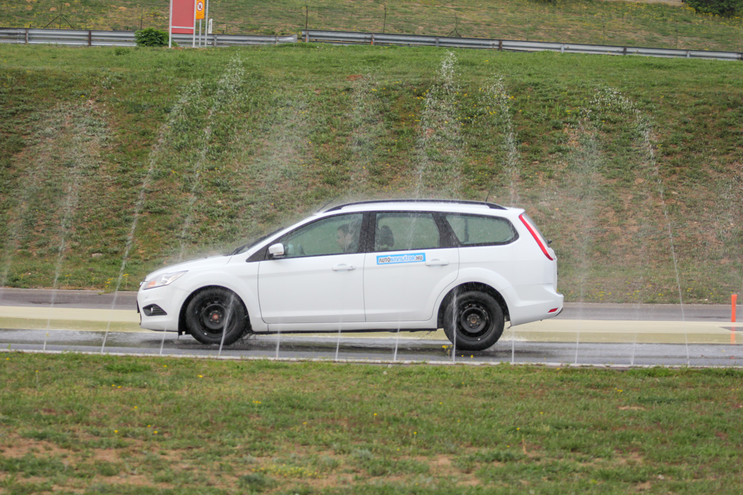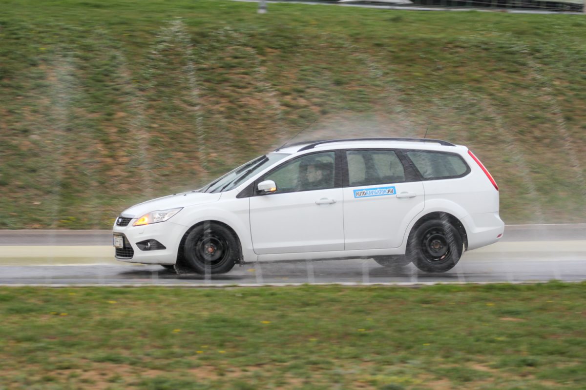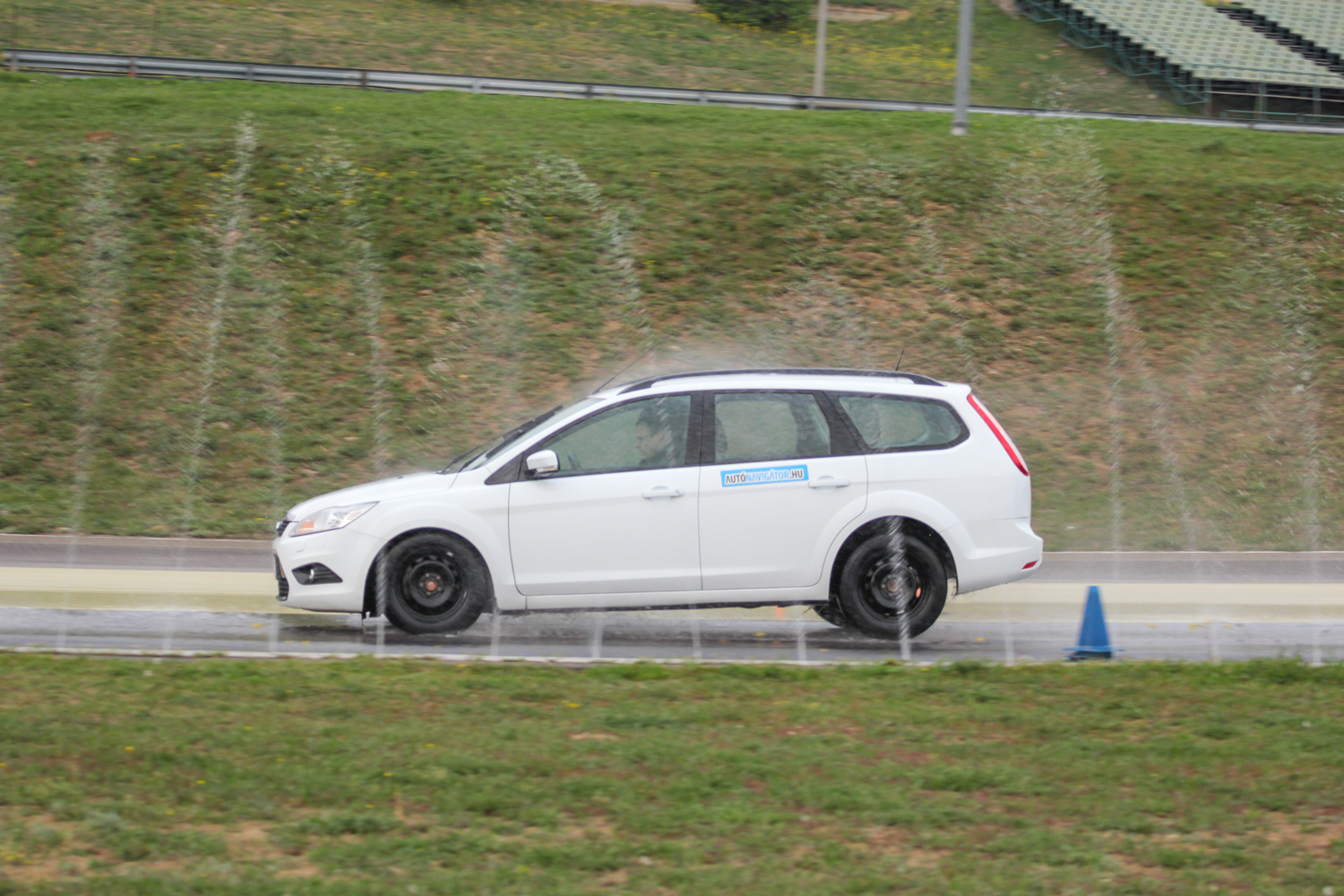 Természetes, hogy a fékút kapcsán mutatott tudás a legfontosabb az abroncsoknál (így ezek is szerepelnek legnagyobb súllyal végső értékelésünkben), de néztünk például kanyarjellemzőket: száraz és nedves aszfalton egységes körön vizsgáltuk, hogy az egyes gumikkal milyen sebességet tudunk elérni. Mivel a Focus hajtáskialakításából adódóan irányonként eltérő érték adódik, az átlagsebességeket írtuk táblázatunkba. Száraz aszfalton a használt gumival lehetett a legnagyobb kanyarsebességet elérni. Az új, a teszt kezdetekor 8, a végére 7 mm körüli profilmélységű abroncsoknál szerényebb, 4 mm-es mintázat kanyarban jól tapadt szárazon, nedves aszfalton viszont már az egyik legrosszabbul, miként a koros abroncs egyéb jellemzők szerint is gyengének bizonyult.