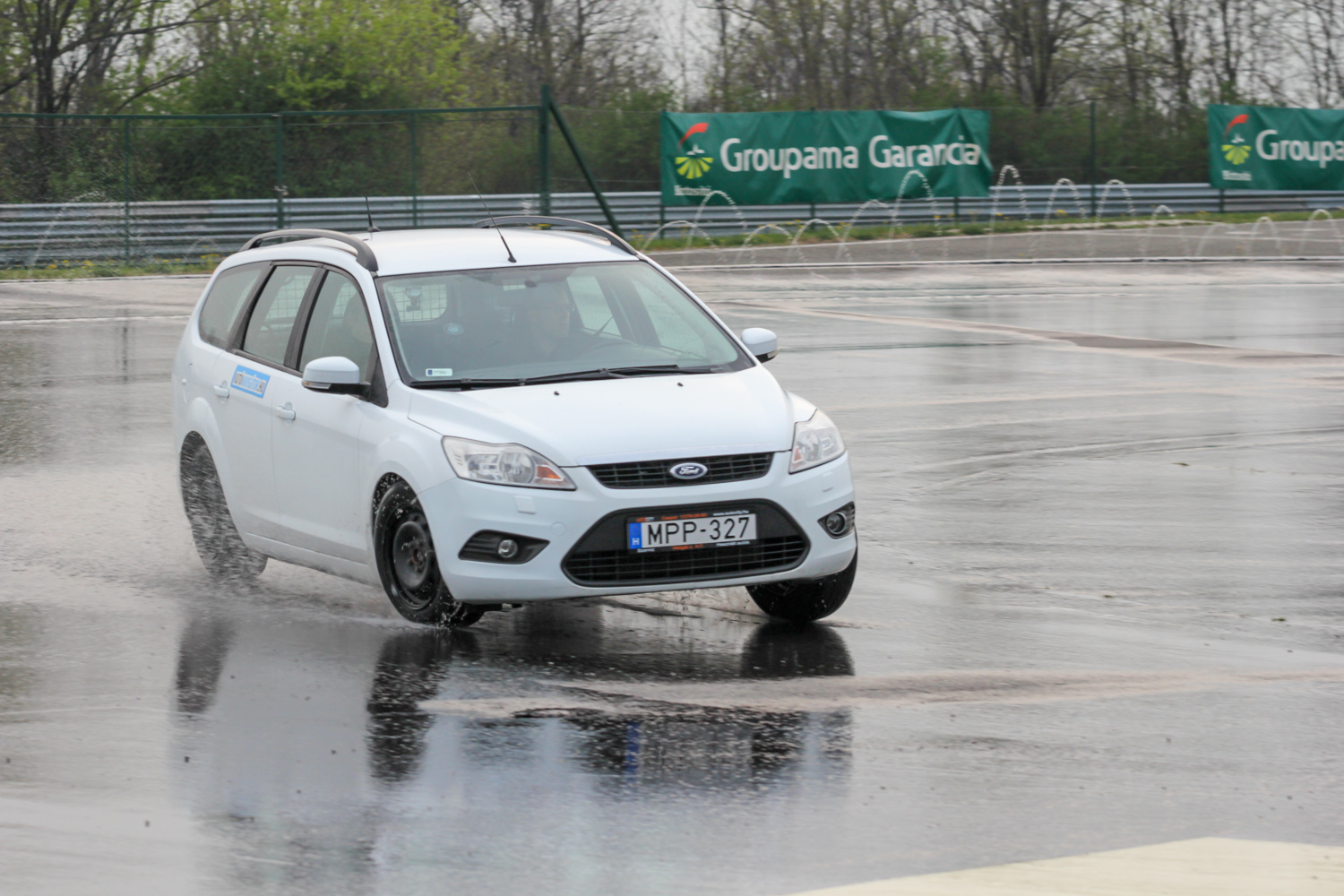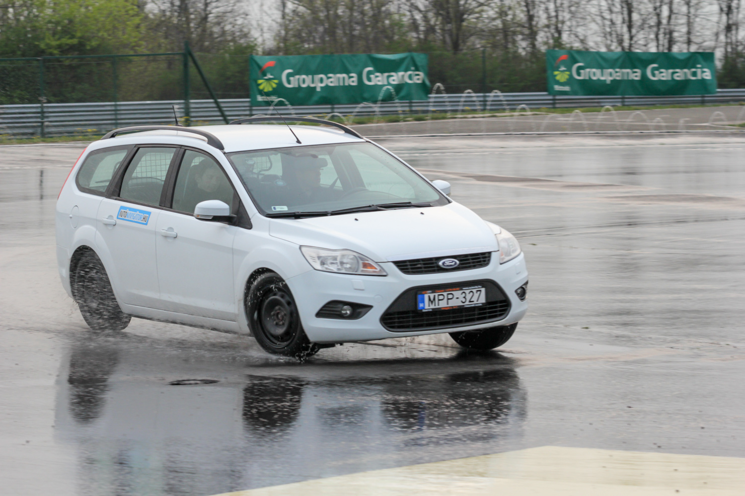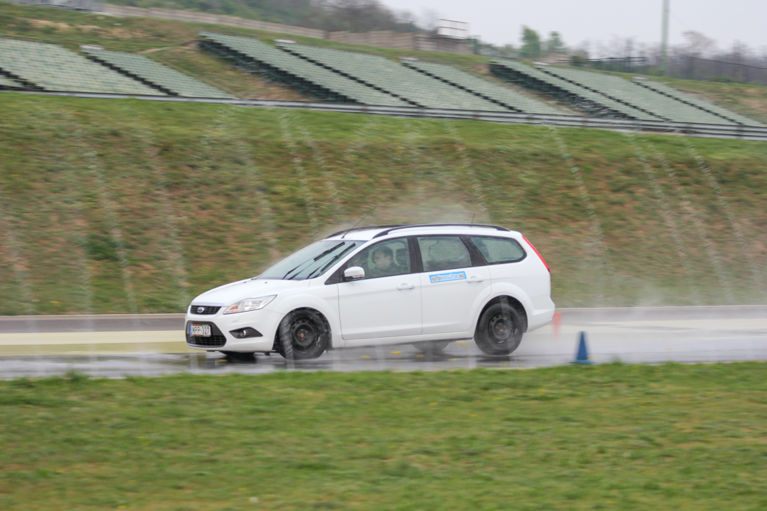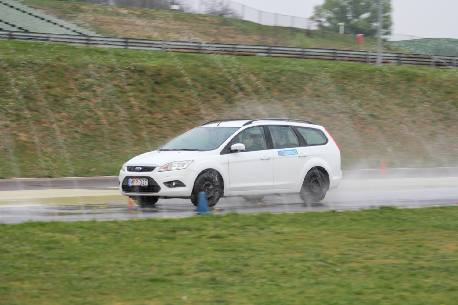 Szokott autókkal – ex-rendőr Ford Focusokkal, szokott helyszínen – a Groupama Garancia Vezetéstechnikai Centrum tanpályáin, illetve a Hungaroring célegyenesében készítettük a nonstopgumi.hu csapatával közös valóságtesztünket