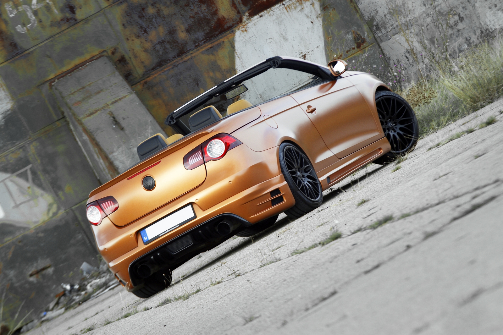 Gyárilag sosem készült ilyen szigorú Volkswagen Eos, mint amilyen az AMTS 2014-en megnyerhető Rieger bodykittes átépített verzió. Emblémája megmaradt, de matt fekete lett