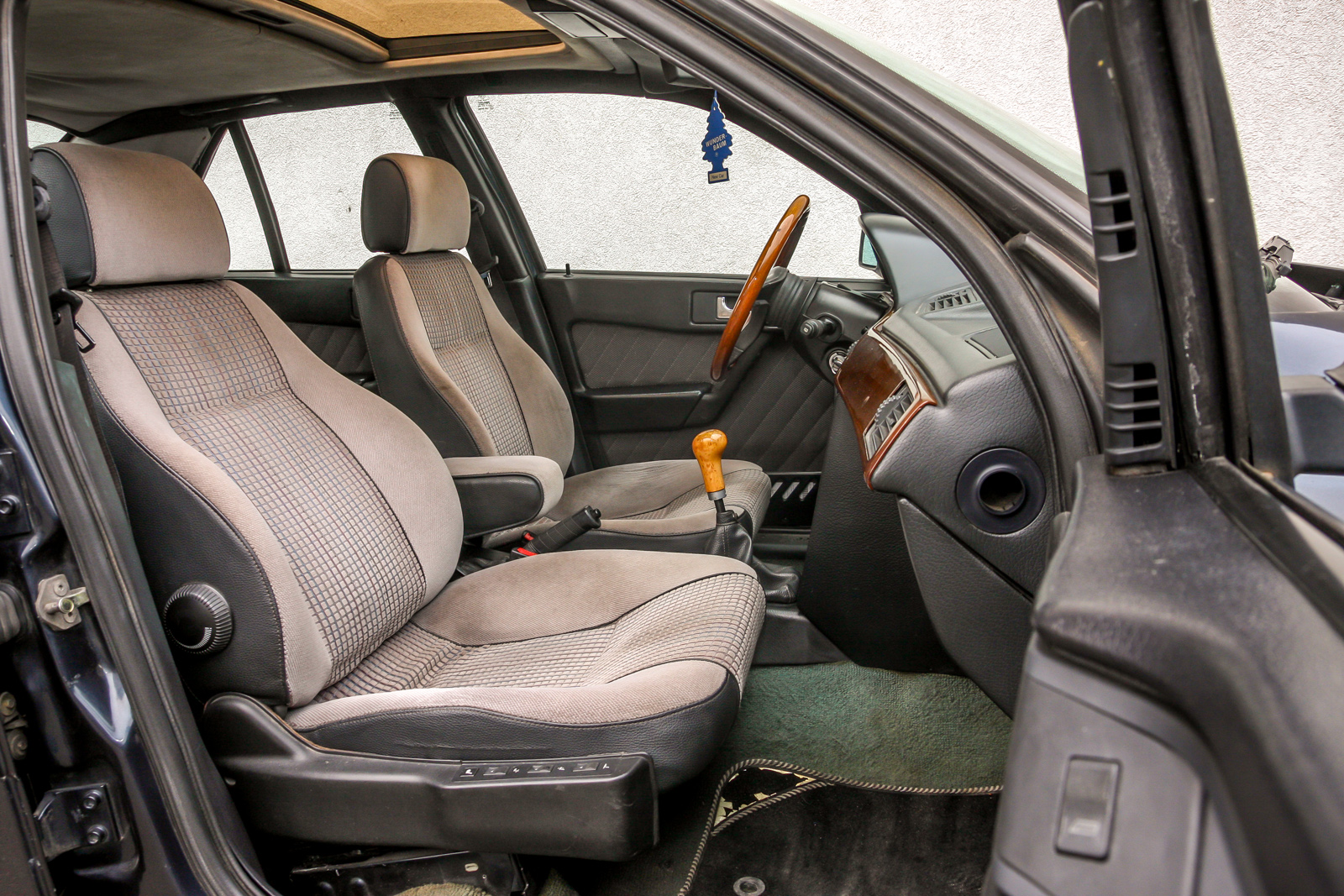 Igen, a tetőkárpit lóg, az ülések foltosak, helyenként likasak, de attól még kényelem, egész sok hely, hátul külön légbeömlő, s még villanyos tetőablak is van