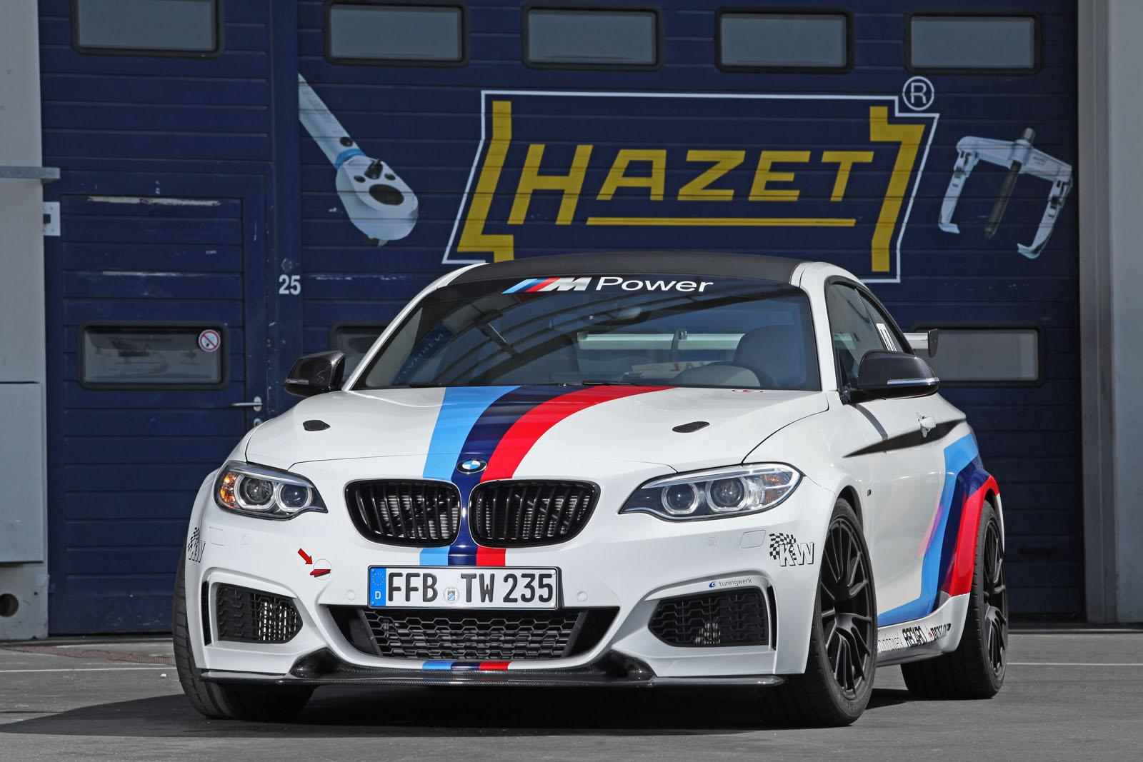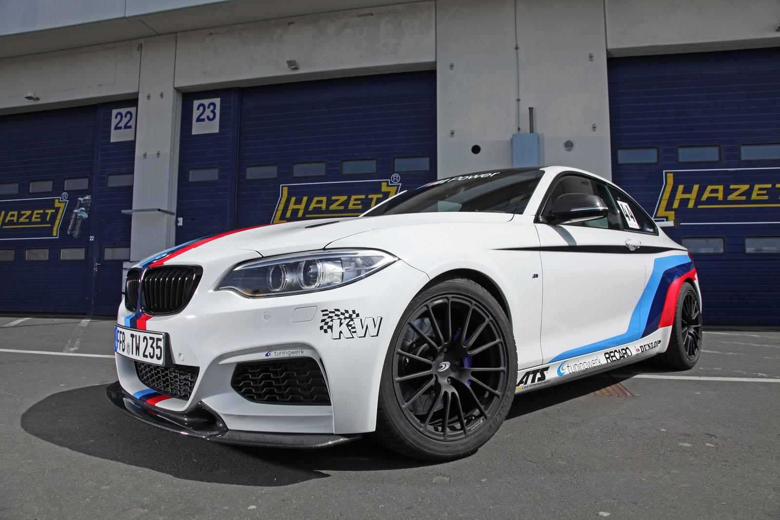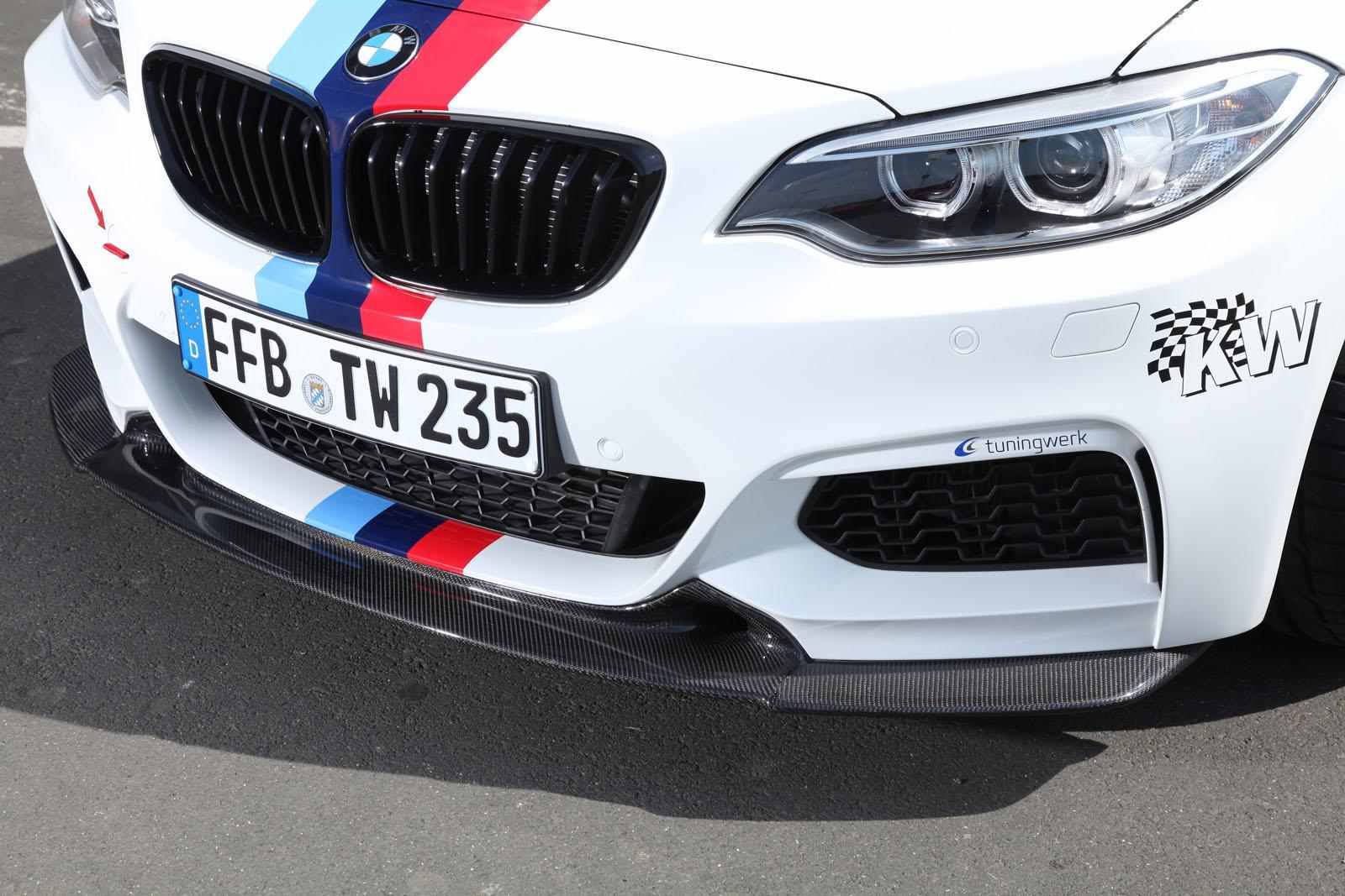 A német Tuningwerk szakemberei mindenesetre ezt és a 450 Nm nyomatékot is kevesellhették, mert a képeken látható RS verzió – egyebek mellett – alumínium olajteknővel, sportkipufogóval 444 lóerőt és 600 Nm-t kínál. Százra 4,3 mp kell csak neki 6 fokozatú manuális váltóval, átdolgozták a hűtőt, a futóművet és a féket is. A 18 colos könnyűfém kerekekre Dunlop SportMaxx RT abroncsokat húztak. Bent Recaro ülés van opciósan hatpontos biztonsági övvel, sportkormánnyal és szénszálas dekorral – a csomag alapból 19 ezer eurót kóstál, az M235i RS-ért minimum 65 ezer eurót, durván 20 millió forintot kérnek.