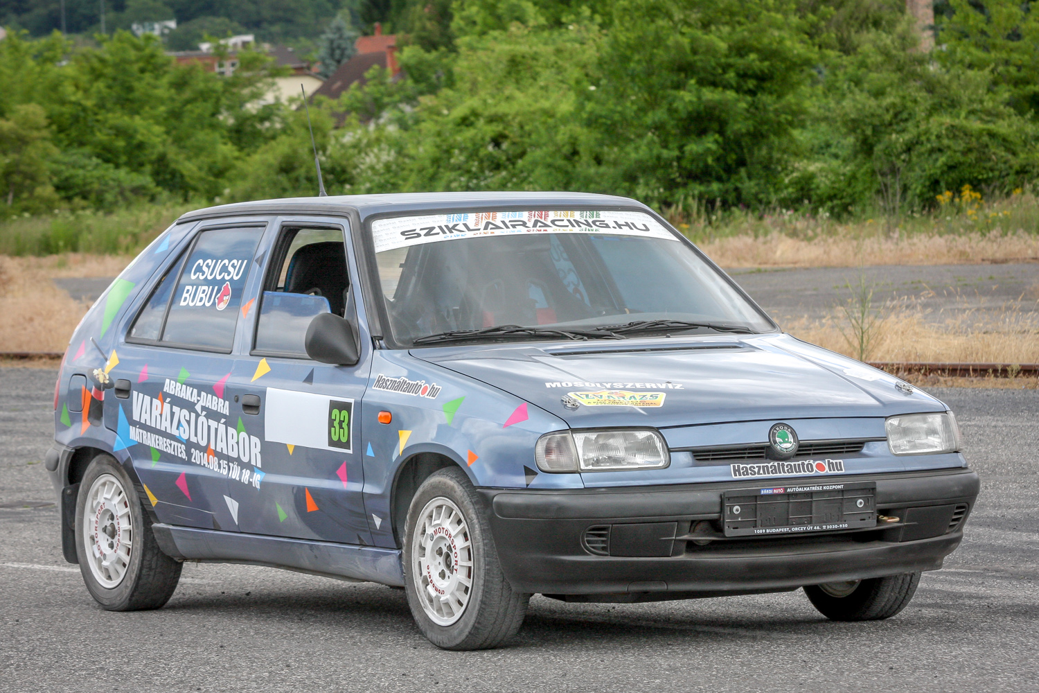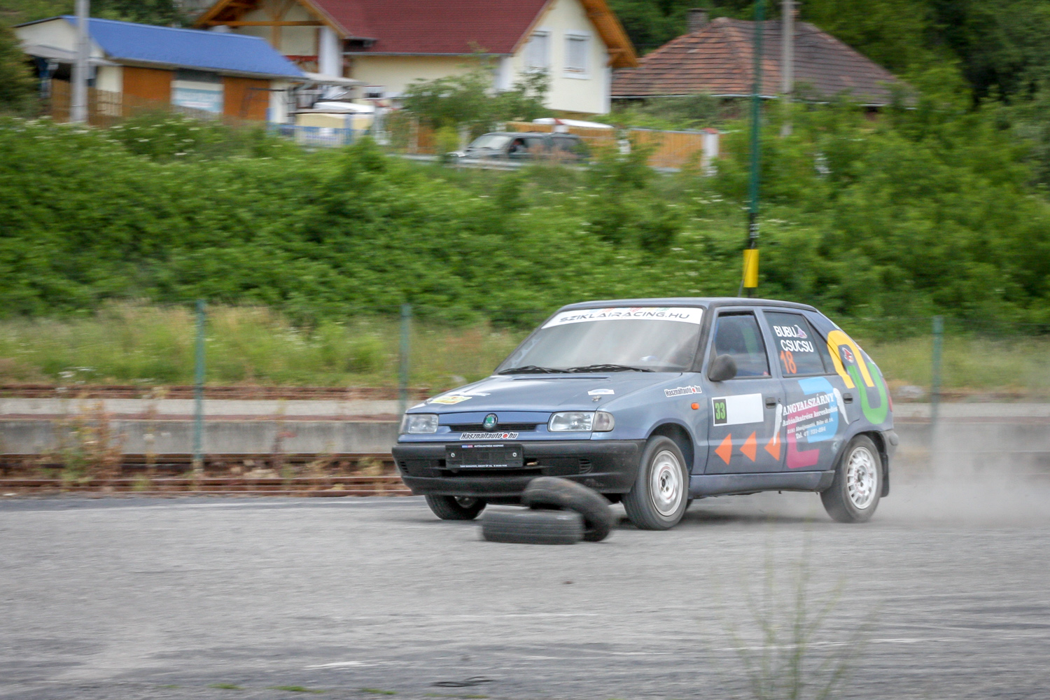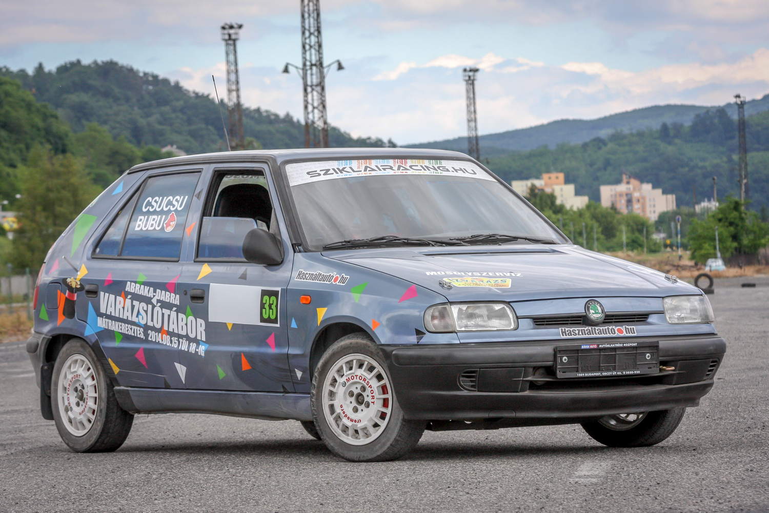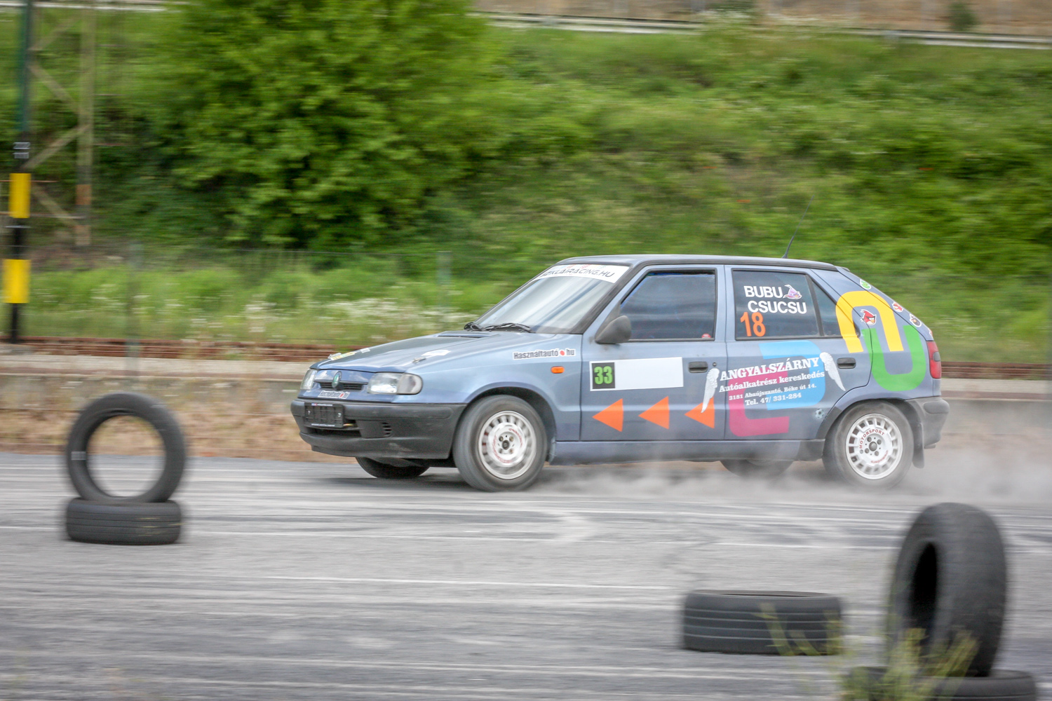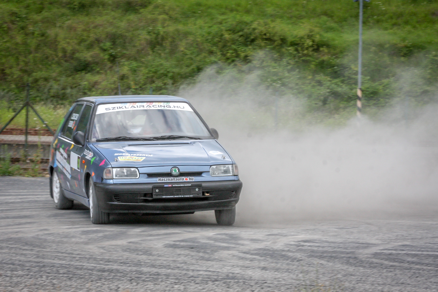 És padló és padló és padló, meg némi matek a kuplunggal. Az erőnek az ő hiányát pótlandó. És harc a (széria) váltóval, ami nem mindig volt partner a sietős kapcsolásban. És zaj és zaj és zaj, gumicsikorgás, kavicspattogás, por és por és por, bóklászás a gumik közt. Még megcsodálom a 14-es fehér Cromodora felni mögött a vörös Brembo féknyerget, az apró tükröt („valami webshopból”), a merevítőn a Skoda Motorsport matricát, az olcsóbb és célszerűbb, mint míves ablakfóliát és ajtóburkolatot, a varázslatos váltógombot és pedálokat, a taposót, az áramtalanítót, a poroltót és az üvegtörő kalapácsot – szerintem így kerek ez a történet, s voltaképp se több ló, se sperr, se semmi más nem hiányzik. Mert akkor már távolról sem lehetne ilyen „filléres” a buli. Bubuék pedig láthatóan élvezik, elégedettek, vagy nem?