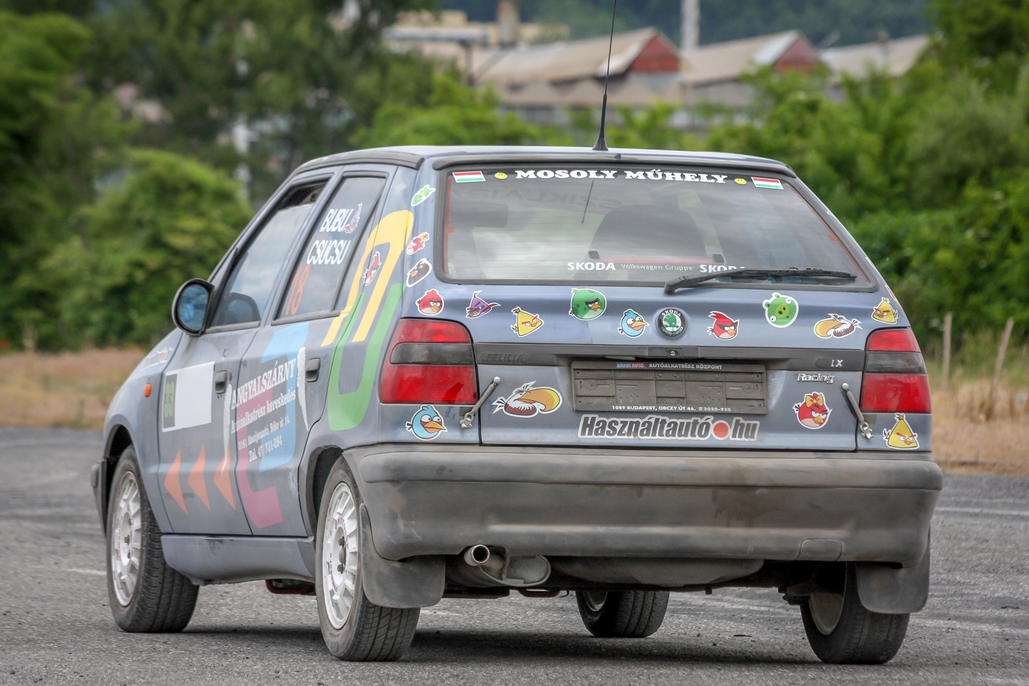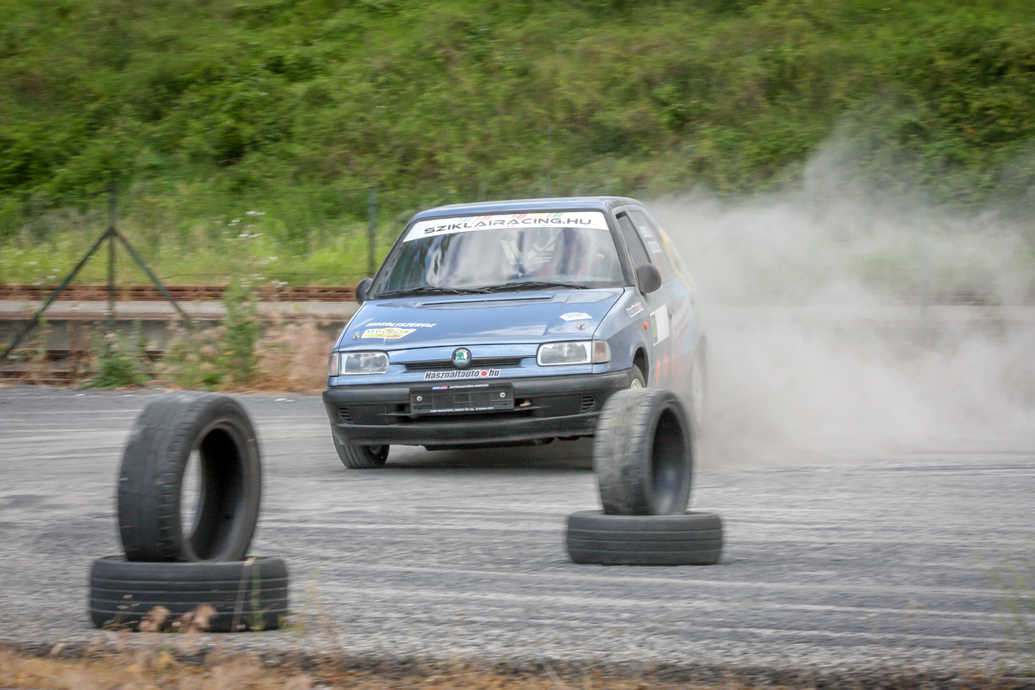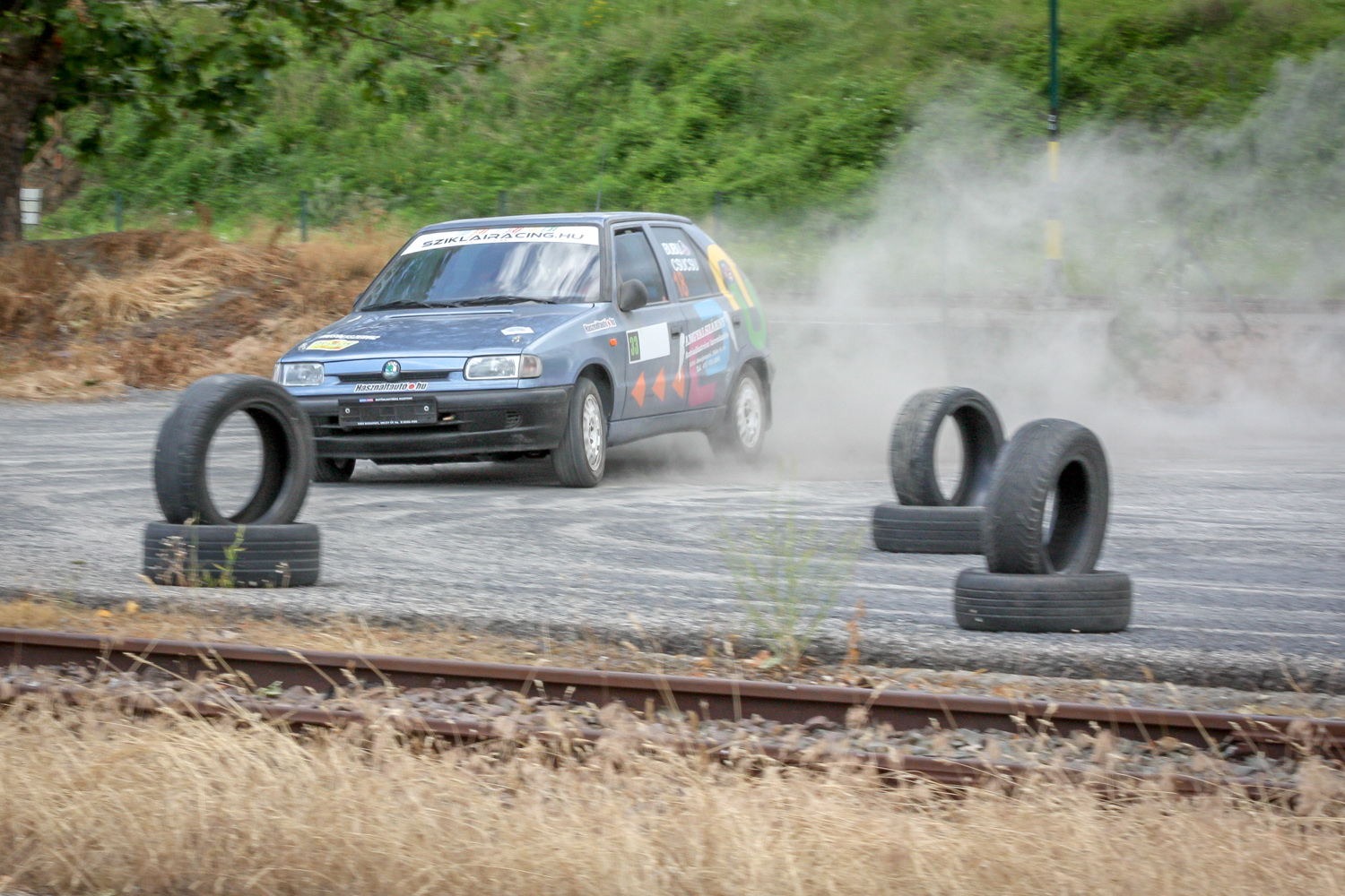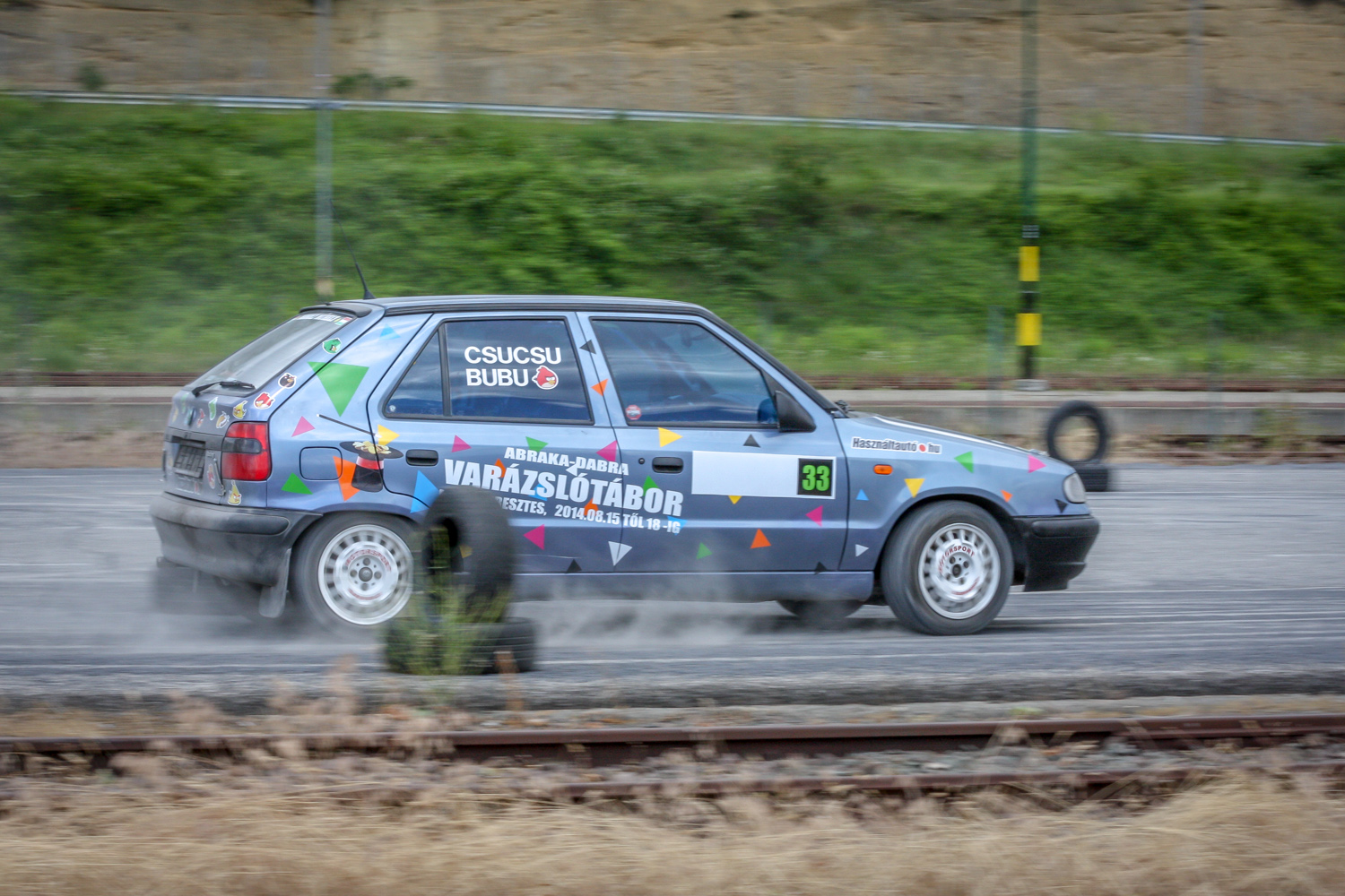 És padló és padló és padló, meg némi matek a kuplunggal. Az erőnek az ő hiányát pótlandó. És harc a (széria) váltóval, ami nem mindig volt partner a sietős kapcsolásban. És zaj és zaj és zaj, gumicsikorgás, kavicspattogás, por és por és por, bóklászás a gumik közt. Még megcsodálom a 14-es fehér Cromodora felni mögött a vörös Brembo féknyerget, az apró tükröt („valami webshopból”), a merevítőn a Skoda Motorsport matricát, az olcsóbb és célszerűbb, mint míves ablakfóliát és ajtóburkolatot, a varázslatos váltógombot és pedálokat, a taposót, az áramtalanítót, a poroltót és az üvegtörő kalapácsot – szerintem így kerek ez a történet, s voltaképp se több ló, se sperr, se semmi más nem hiányzik. Mert akkor már távolról sem lehetne ilyen „filléres” a buli. Bubuék pedig láthatóan élvezik, elégedettek, vagy nem?