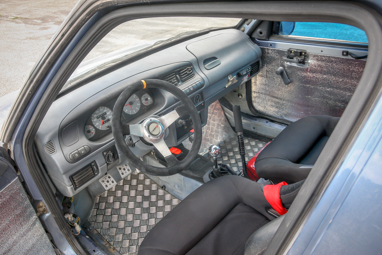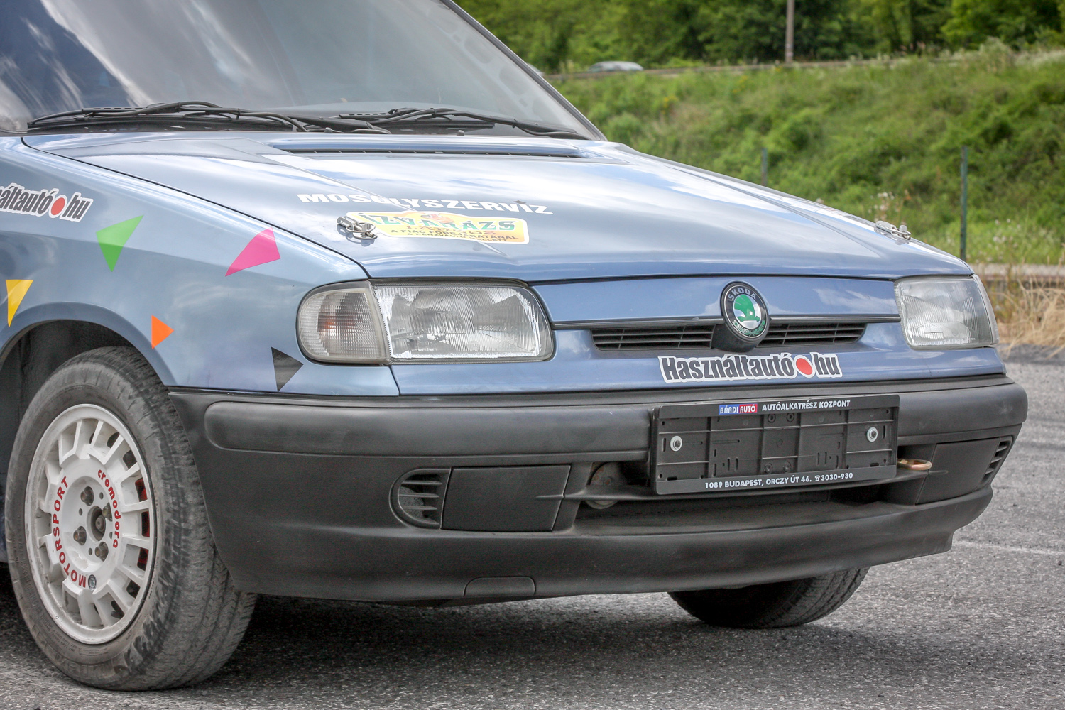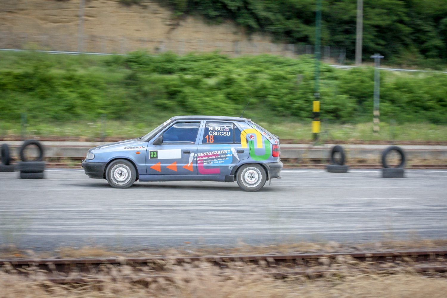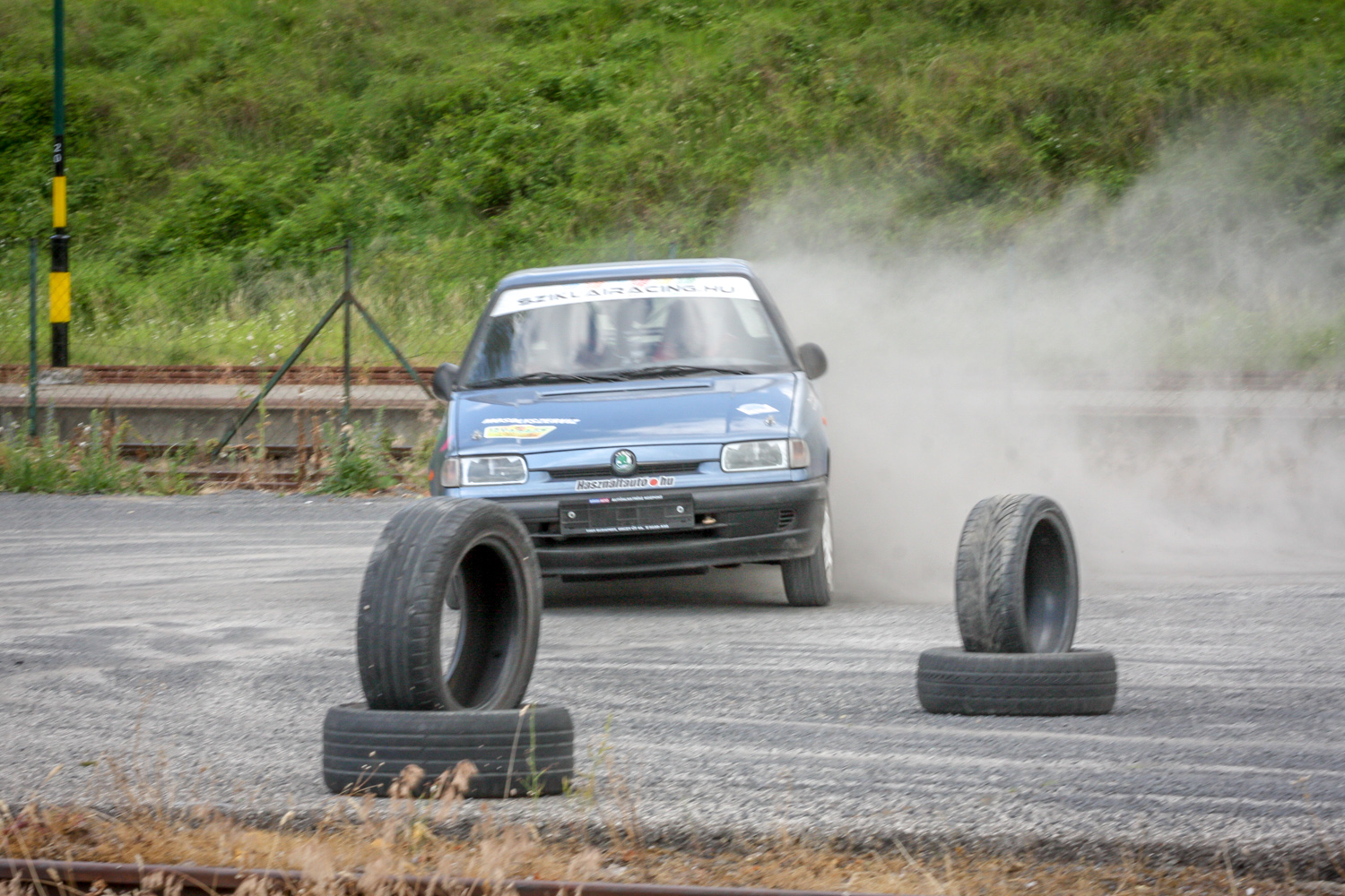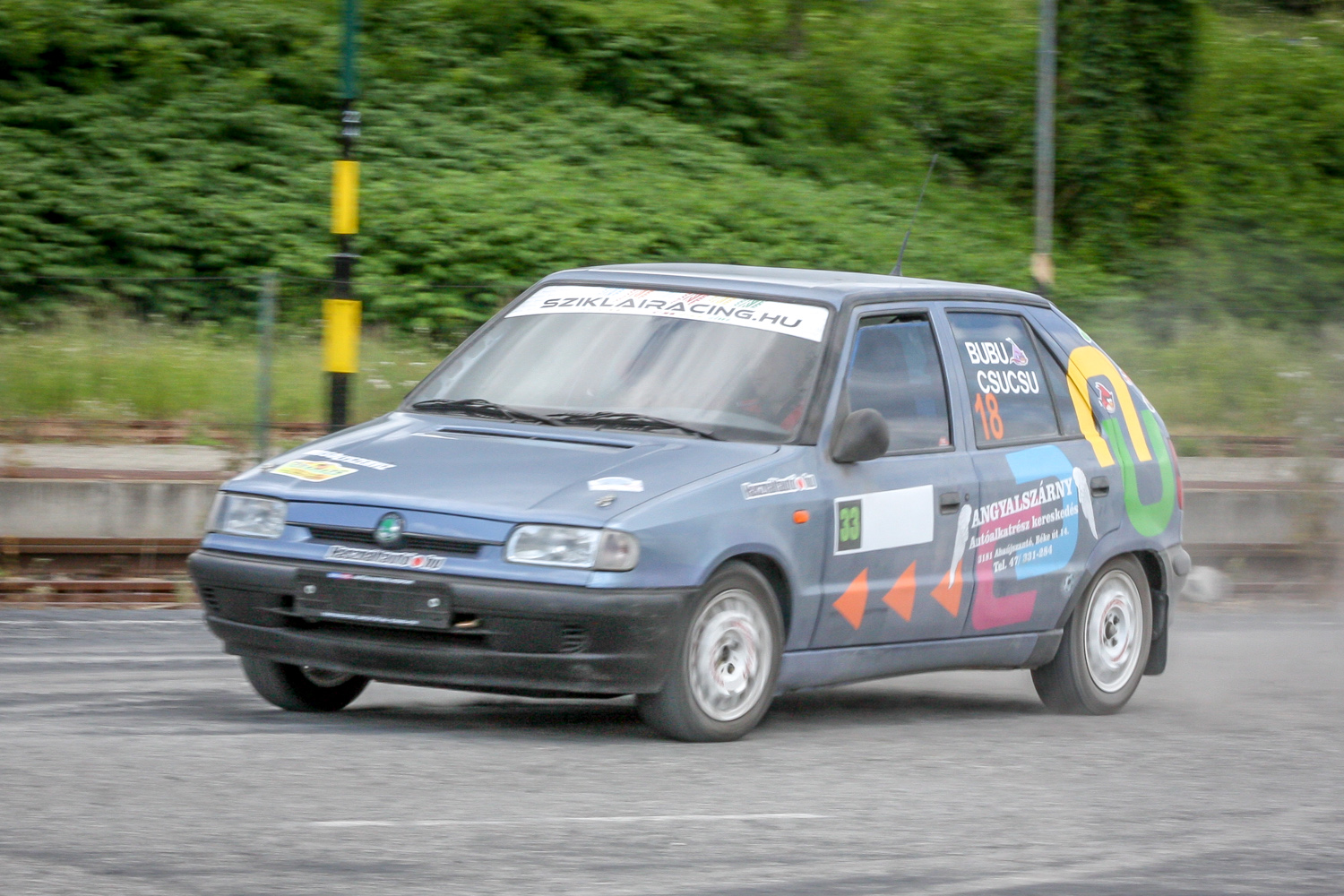 És padló és padló és padló, meg némi matek a kuplunggal. Az erőnek az ő hiányát pótlandó. És harc a (széria) váltóval, ami nem mindig volt partner a sietős kapcsolásban. És zaj és zaj és zaj, gumicsikorgás, kavicspattogás, por és por és por, bóklászás a gumik közt. Még megcsodálom a 14-es fehér Cromodora felni mögött a vörös Brembo féknyerget, az apró tükröt („valami webshopból”), a merevítőn a Skoda Motorsport matricát, az olcsóbb és célszerűbb, mint míves ablakfóliát és ajtóburkolatot, a varázslatos váltógombot és pedálokat, a taposót, az áramtalanítót, a poroltót és az üvegtörő kalapácsot – szerintem így kerek ez a történet, s voltaképp se több ló, se sperr, se semmi más nem hiányzik. Mert akkor már távolról sem lehetne ilyen „filléres” a buli. Bubuék pedig láthatóan élvezik, elégedettek, vagy nem?