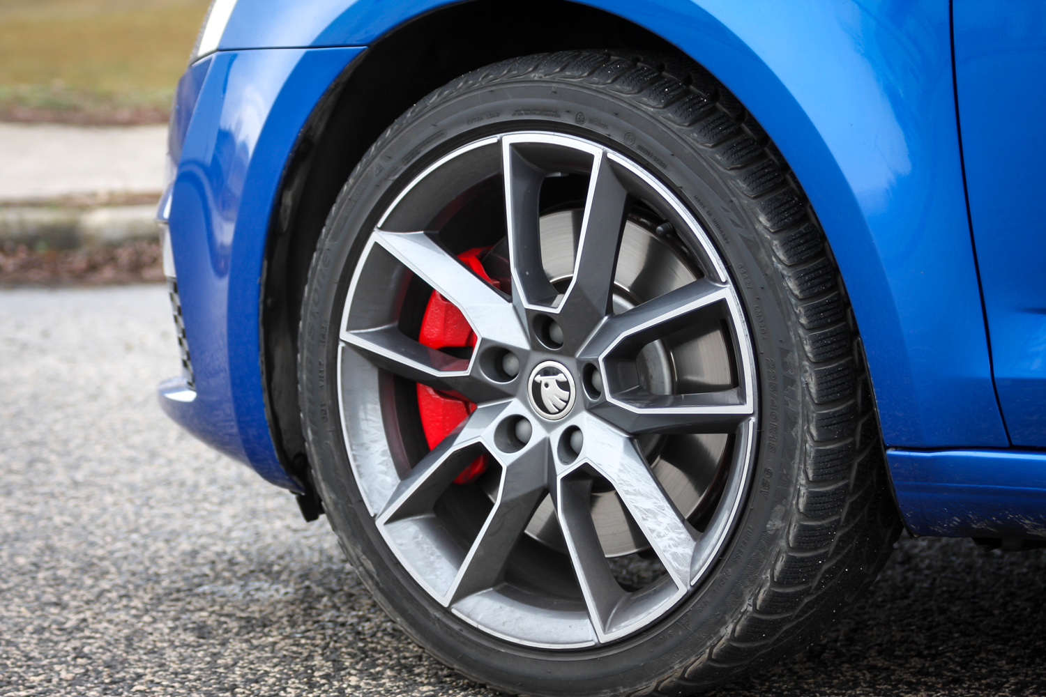 A rajtprogrammal sem békültem meg, de az is lehet, hogy csak nem voltam elég ügyes és kitartó, hogy ráleljek a megfelelő beállításra (ASR off, váltó S-be, bal láb a féken, gáz, fordulat 4000-en). Mindegy, padlózásra úgyis mindig csak elforgás és pattogás, a négy tenyérnyi felület tapadásért sírása volt a válasz. A sportos vezetői profilt kiválasztva meg még V8-szerű mesterséges hangaláfestés, ám ezen még dolgozhattak volna a drága csehek (vagy németek?), mert nem az igazi. Fék? A tesztautóban picit nyúlósnak tűnt. Futómű? Elöl MacPherson, hátul multilink. Minimális (másfél centis) ültetés, szimpatikus, nem túlzott feszesség, csekély oldaldőlés, harmónia.