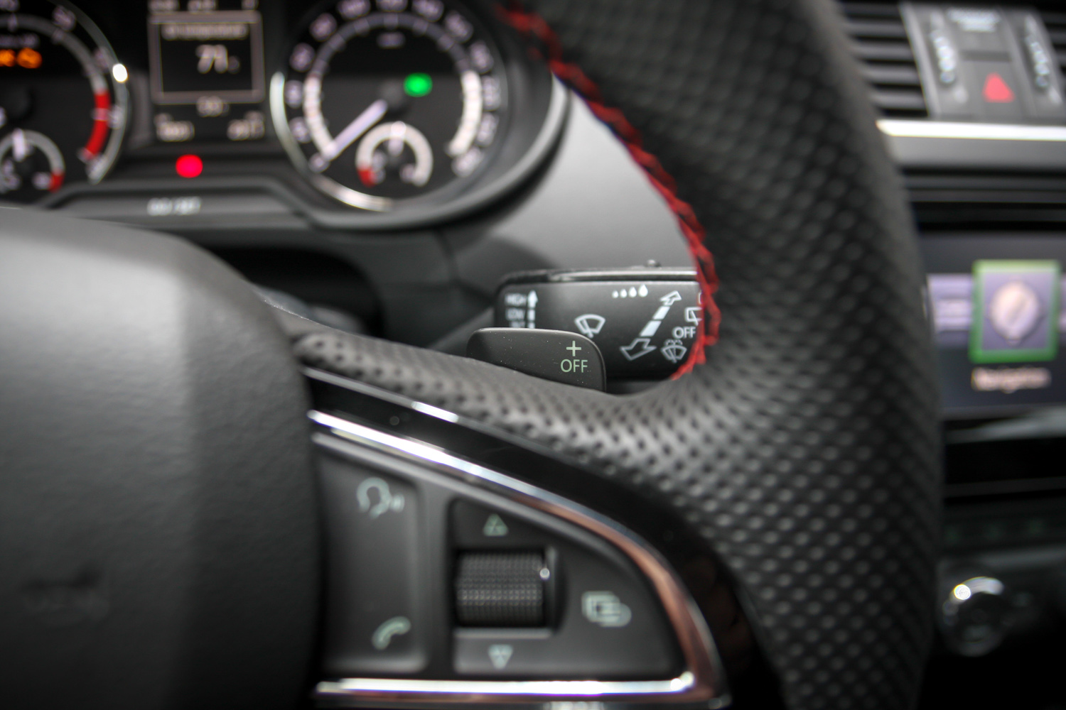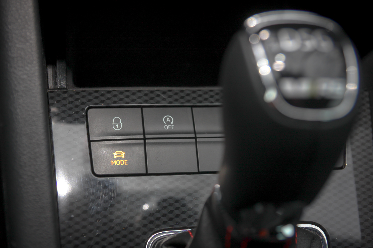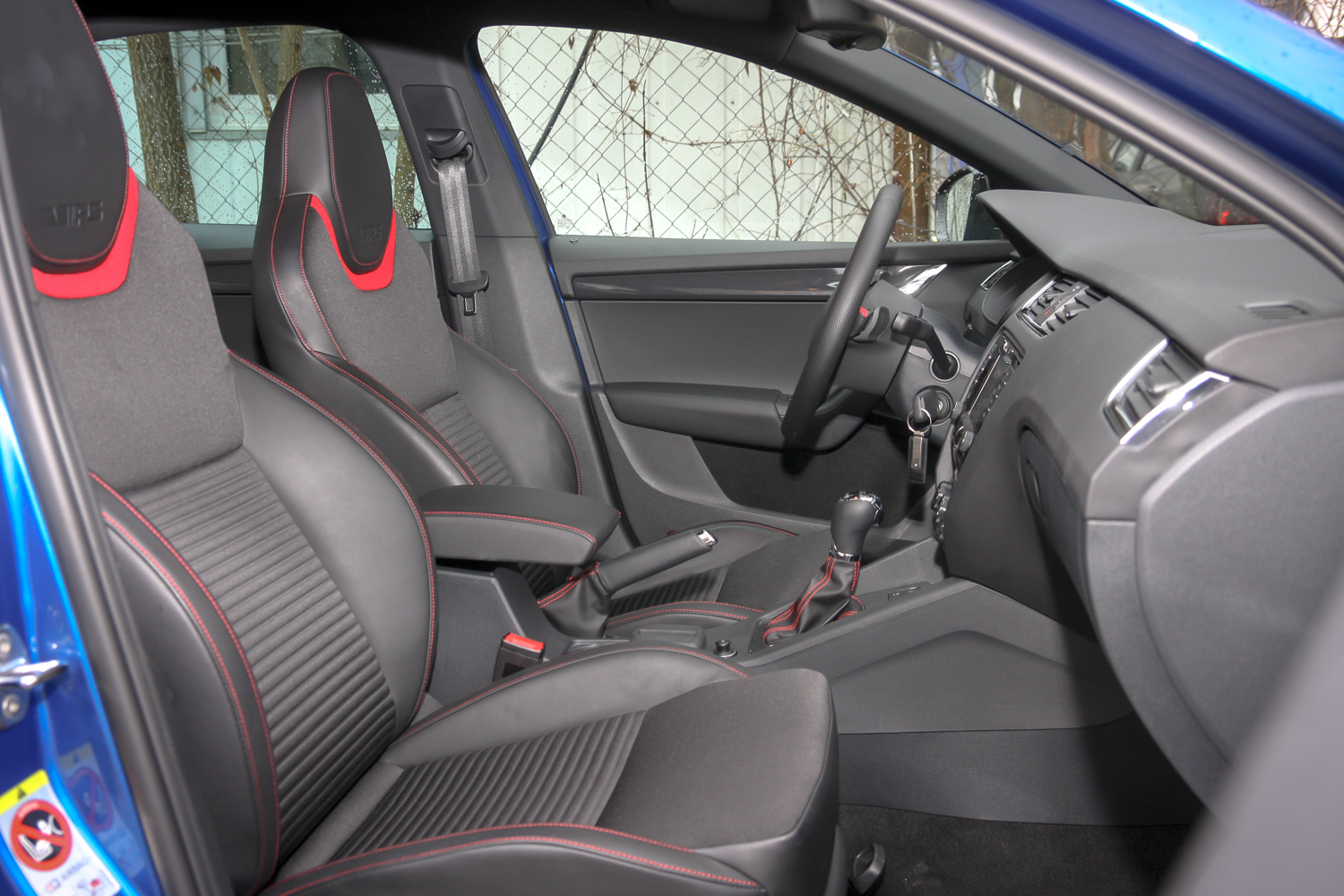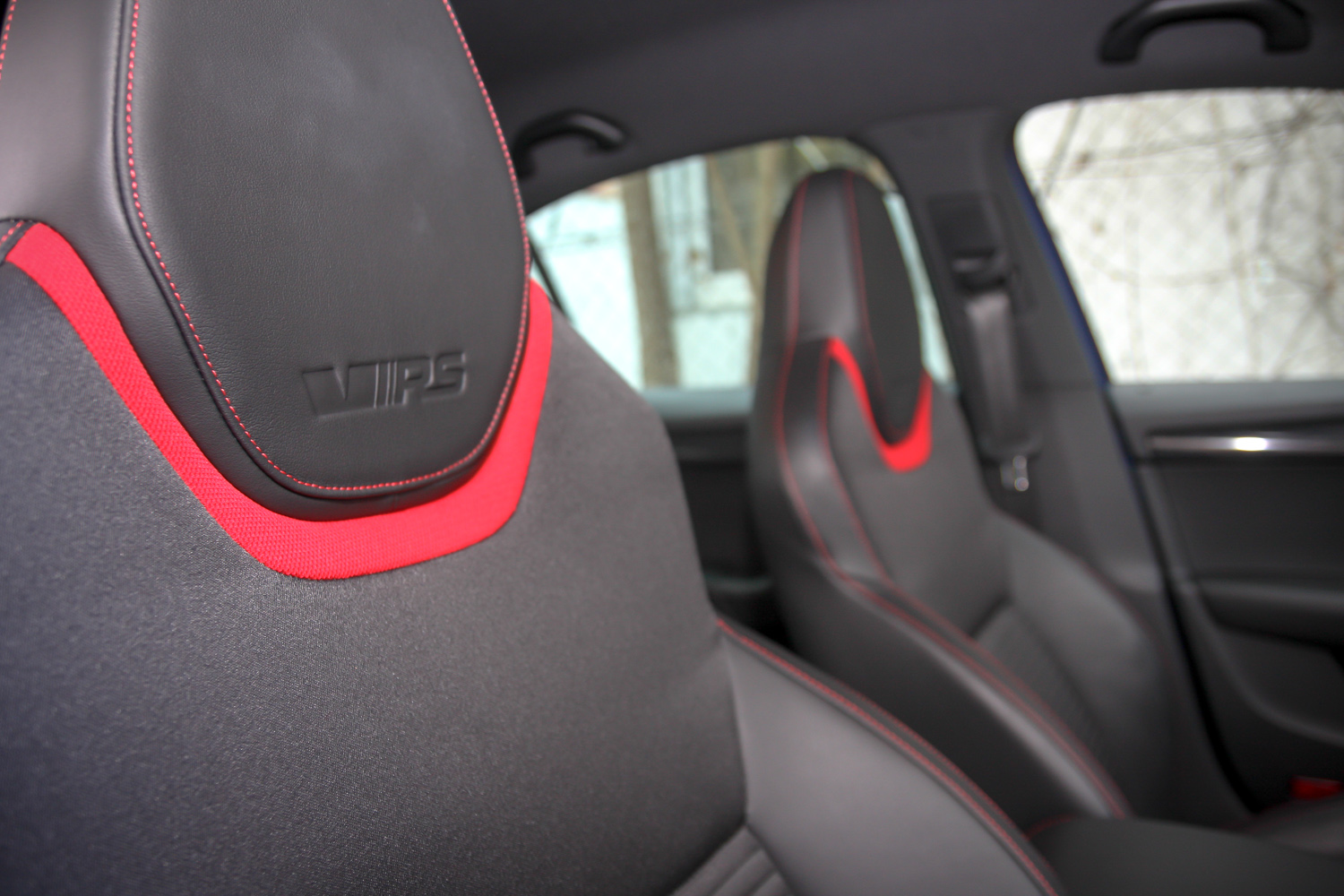Rakodórekesz elég van, az ajtózsebben elfér egy másfél literes palack is. A kartámasz állítható magasságú, csúsztatható. Az első ülések integrált fejtámlásak, a logók és a vörös (vagy szürke) cérnás varrás mellett színes betétek, karbonutánzat műanyagok dobják fel a hangulatot. A tetőkárpit „sportosan” fekete, mind a négy elektromos ablakemelő le-fel automata, a pedálok fémesek. Már-már fura, hogy nem lapított aljú a háromküllős kormány. A középkonzol zongoralakk dekorja persze itt is zsírosodik és szöszösödik, a francnak lenne kedve naponta törölgetni.
