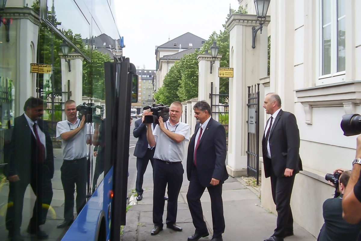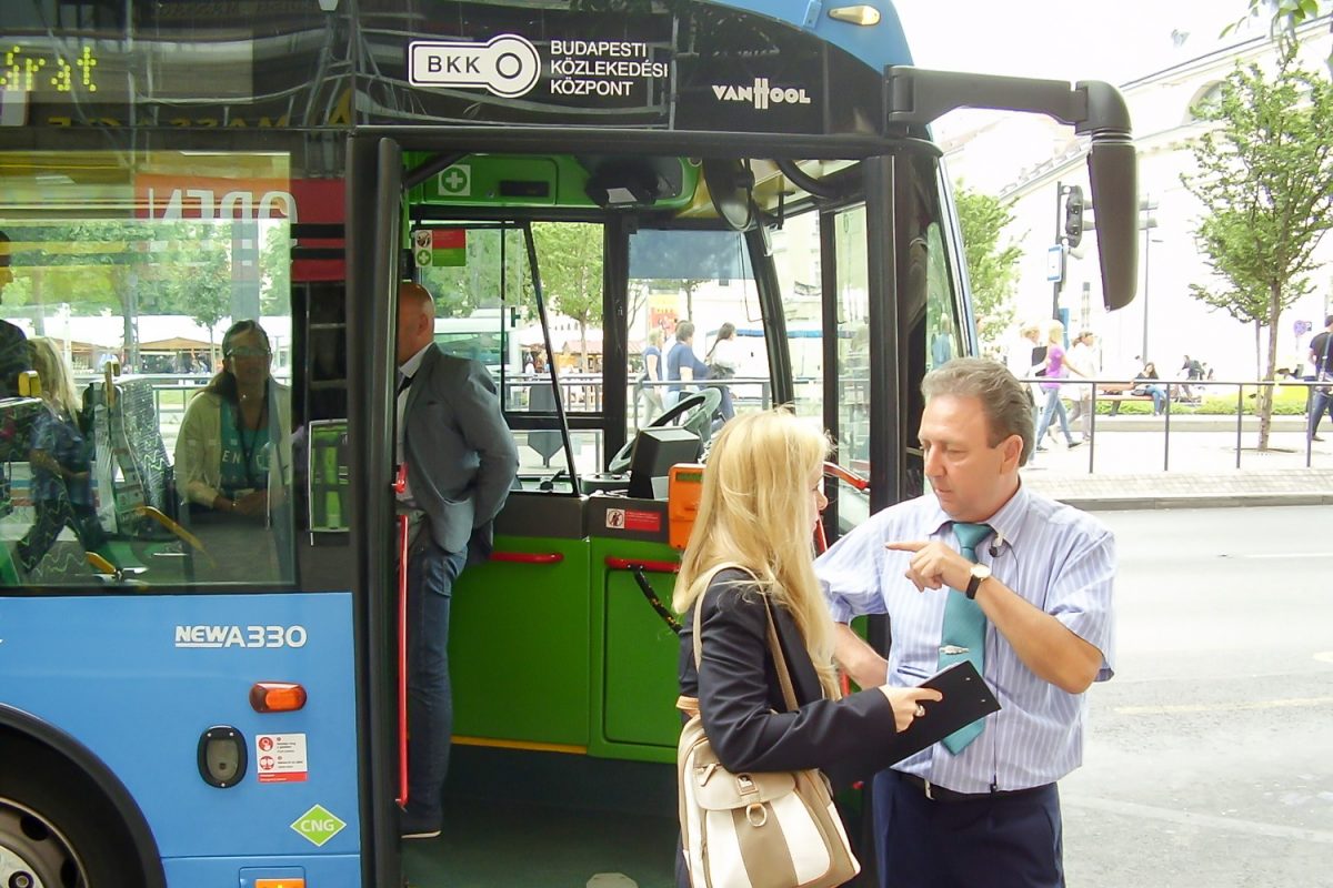 Volt olyan kolléga, aki stílusosan, egy teljesen elektromos Nissan Leaf tesztautóval érkezett a helyszínre, de a legtöbben a városon áthajtó különjárattal érkeztek. Az újságírókkal együtt az átadóban érdekelt cégek és közületek vezetői is buszoztak. Vitézy Dávidot, a BKK vezérigazgatóját így már menet közben kifaggattuk a CNG-buszokról. Tőle tudtam meg, hogy a 2010 őszén alapult BKK a fővárostól és a BKV-tól átvett szerepkörökben, a tömegközlekedési eszközök közül a jó ezer darab magaspadlós buszból már 500-at lecserélt. Vagy újakra, vagy a tizen-, sőt huszonéves Ikarusoknál fiatalabbakra, de mindenképpen környezetkímélőbbekre. A cél, hogy 2018-ra csak alacsonypadlós busz közlekedjen.