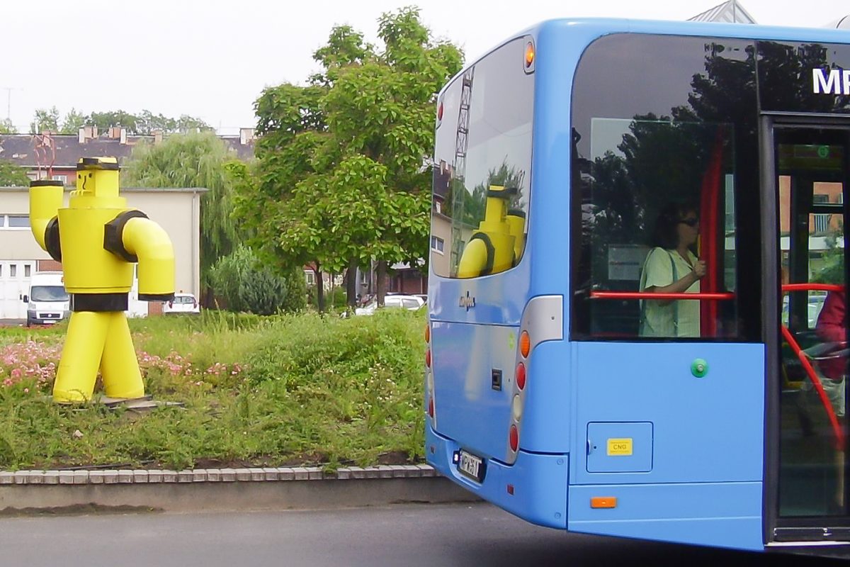 A Főgáz kabalafigurája integet a gáztelepre behajtó CNG-busznak. A Van Hool ablaktörő kalapácsaira nem az elektronika, hanem a sofőr vigyáz