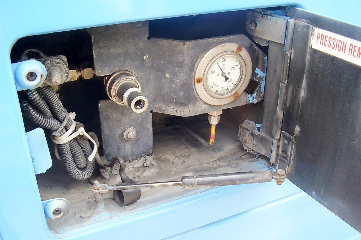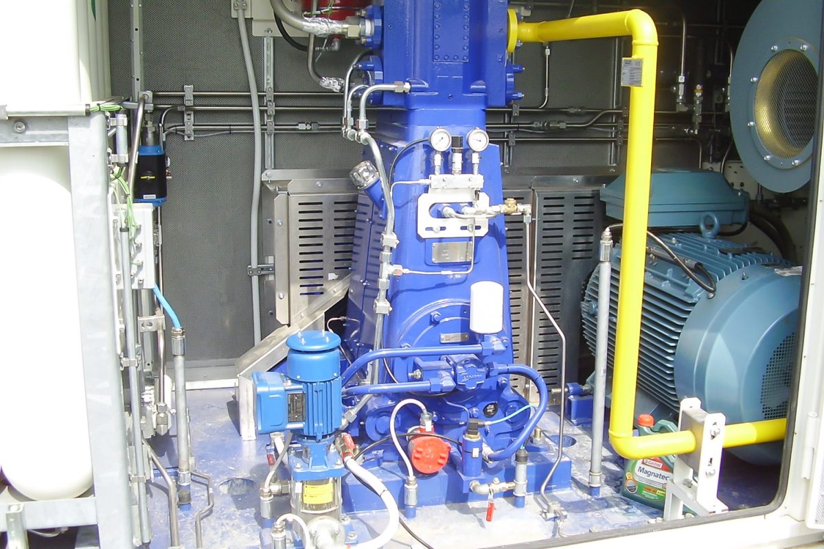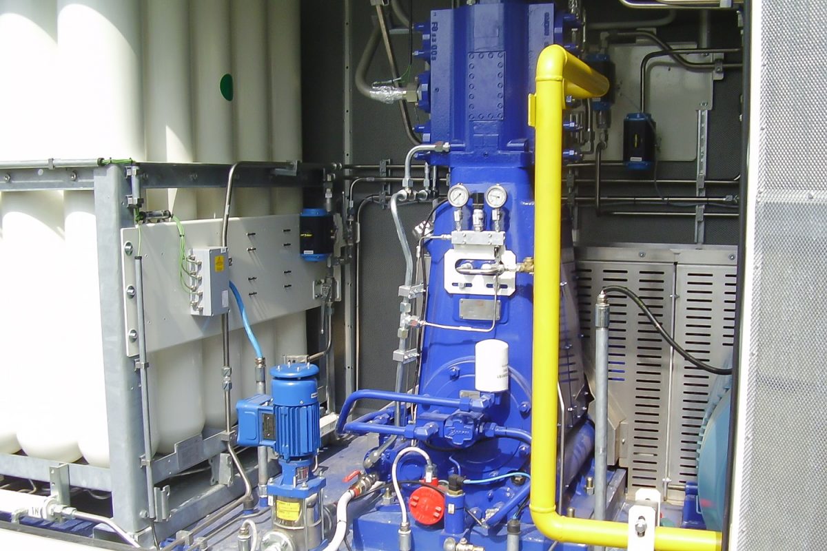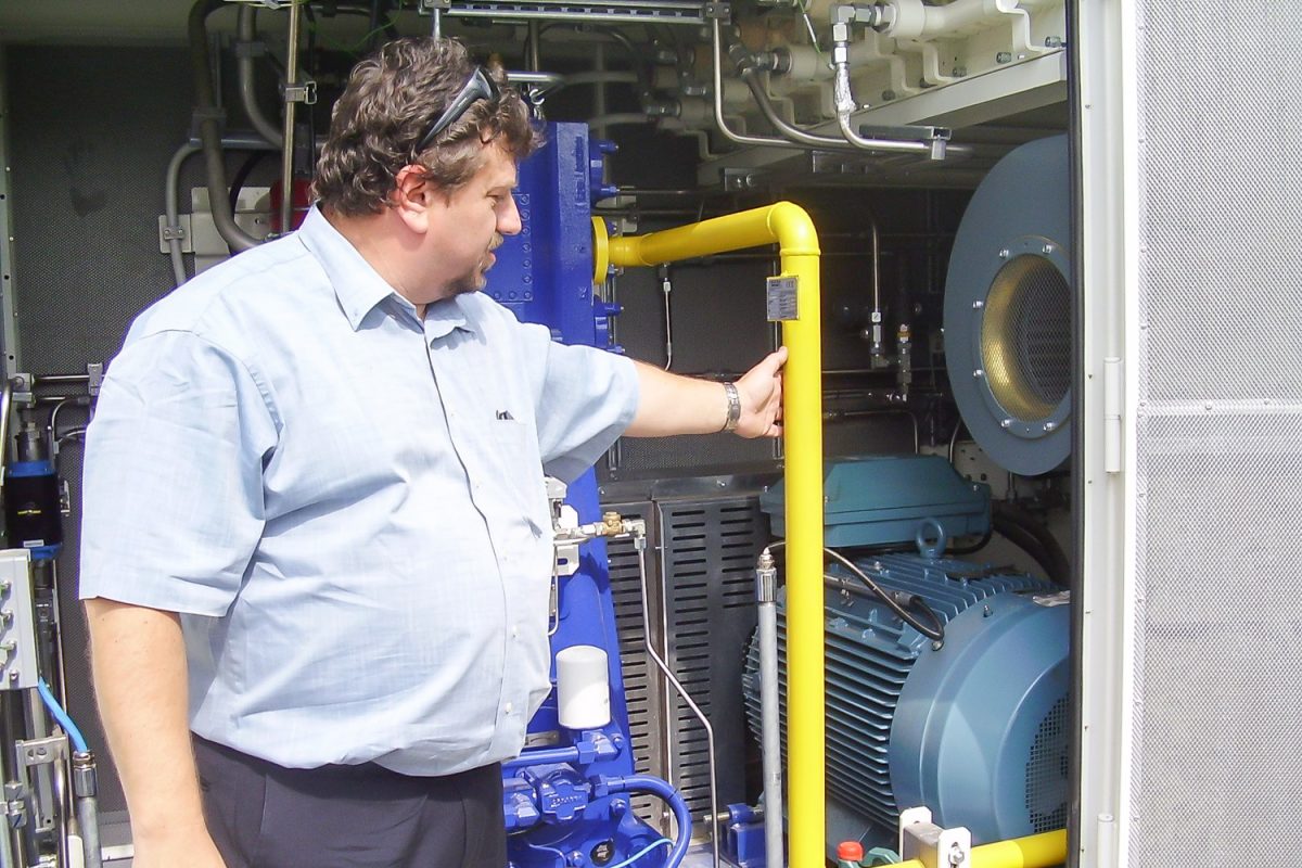 Balra a kútoszlop, jobbra az őt éltető nagy teljesítményű, 200 kW-os kompresszor. 1000 köbmétert tud átfejteni egy óra alatt, 230 baros nyomással. Bármilyen féllépő hiba esetén önműködően leáll a rendszer, tankolás közben a buszt sem lehet elindítani