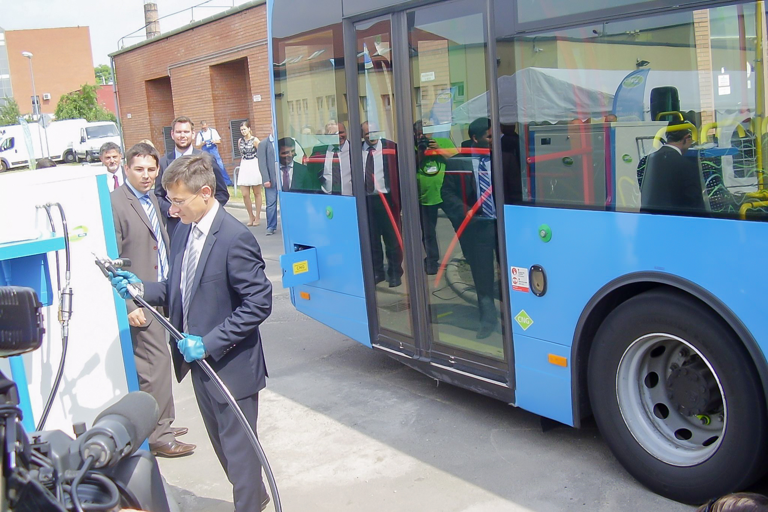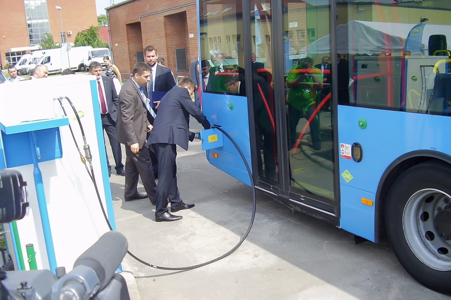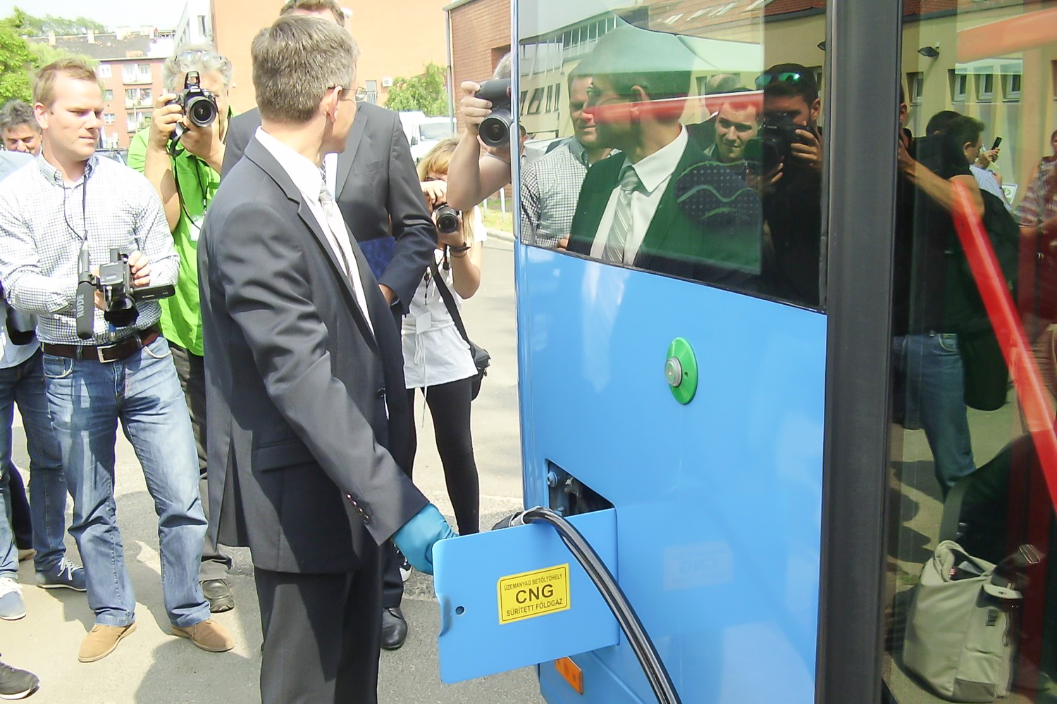 Volt olyan kolléga, aki stílusosan, egy teljesen elektromos Nissan Leaf tesztautóval érkezett a helyszínre, de a legtöbben a városon áthajtó különjárattal érkeztek. Az újságírókkal együtt az átadóban érdekelt cégek és közületek vezetői is buszoztak. Vitézy Dávidot, a BKK vezérigazgatóját így már menet közben kifaggattuk a CNG-buszokról. Tőle tudtam meg, hogy a 2010 őszén alapult BKK a fővárostól és a BKV-tól átvett szerepkörökben, a tömegközlekedési eszközök közül a jó ezer darab magaspadlós buszból már 500-at lecserélt. Vagy újakra, vagy a tizen-, sőt huszonéves Ikarusoknál fiatalabbakra, de mindenképpen környezetkímélőbbekre. A cél, hogy 2018-ra csak alacsonypadlós busz közlekedjen.