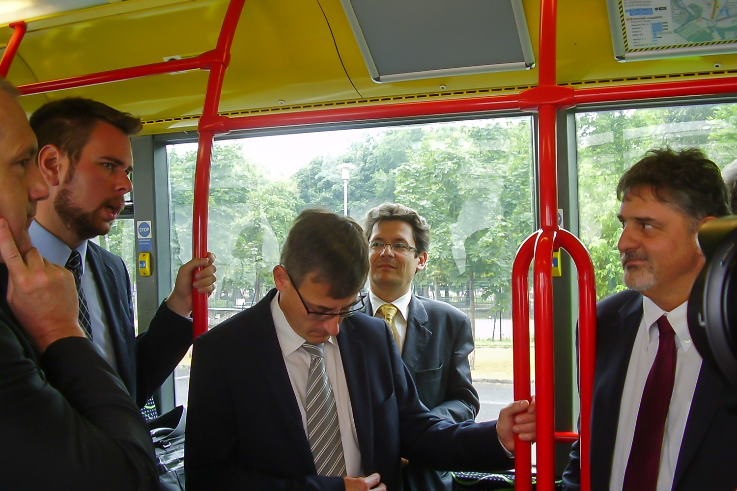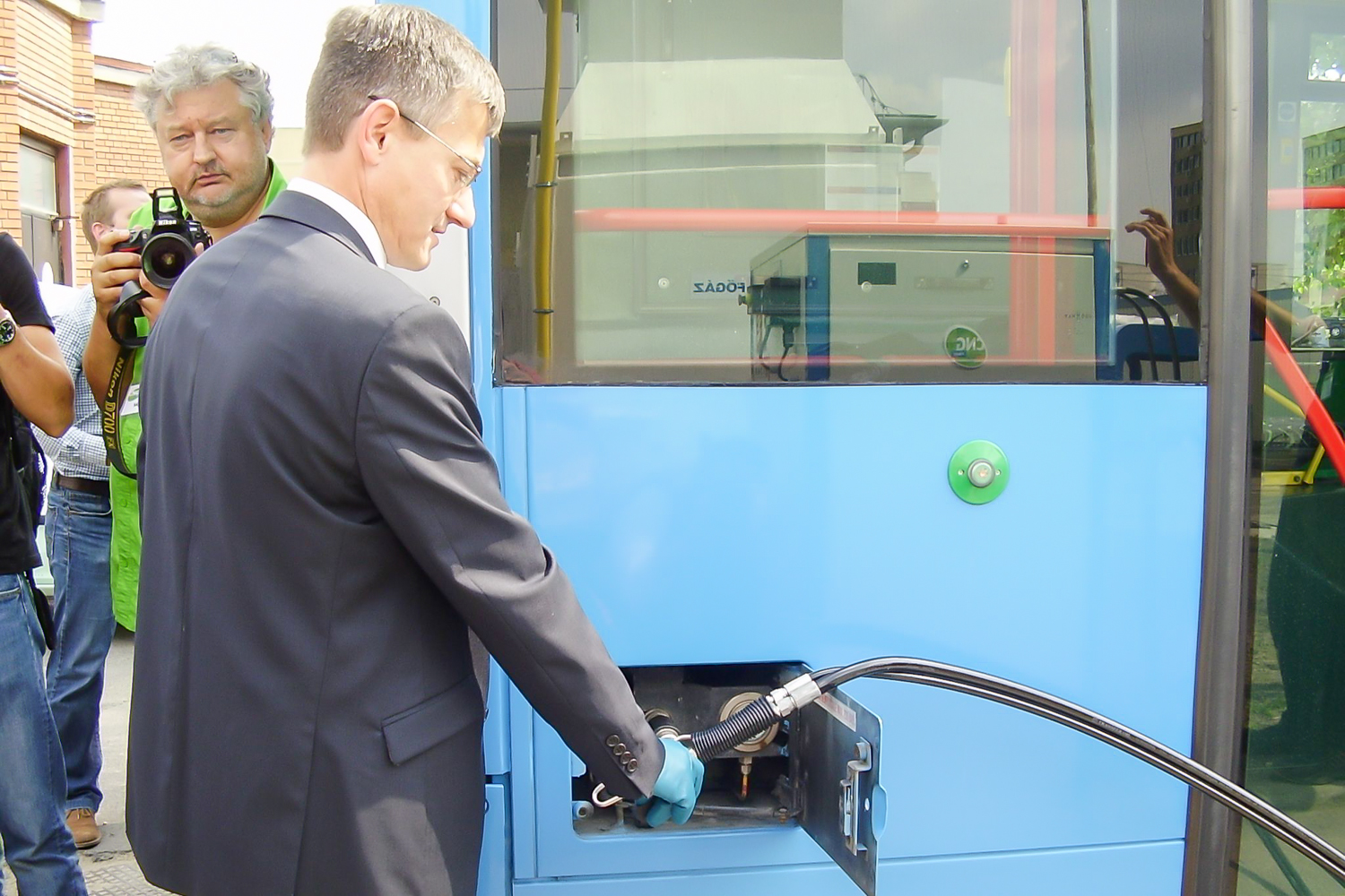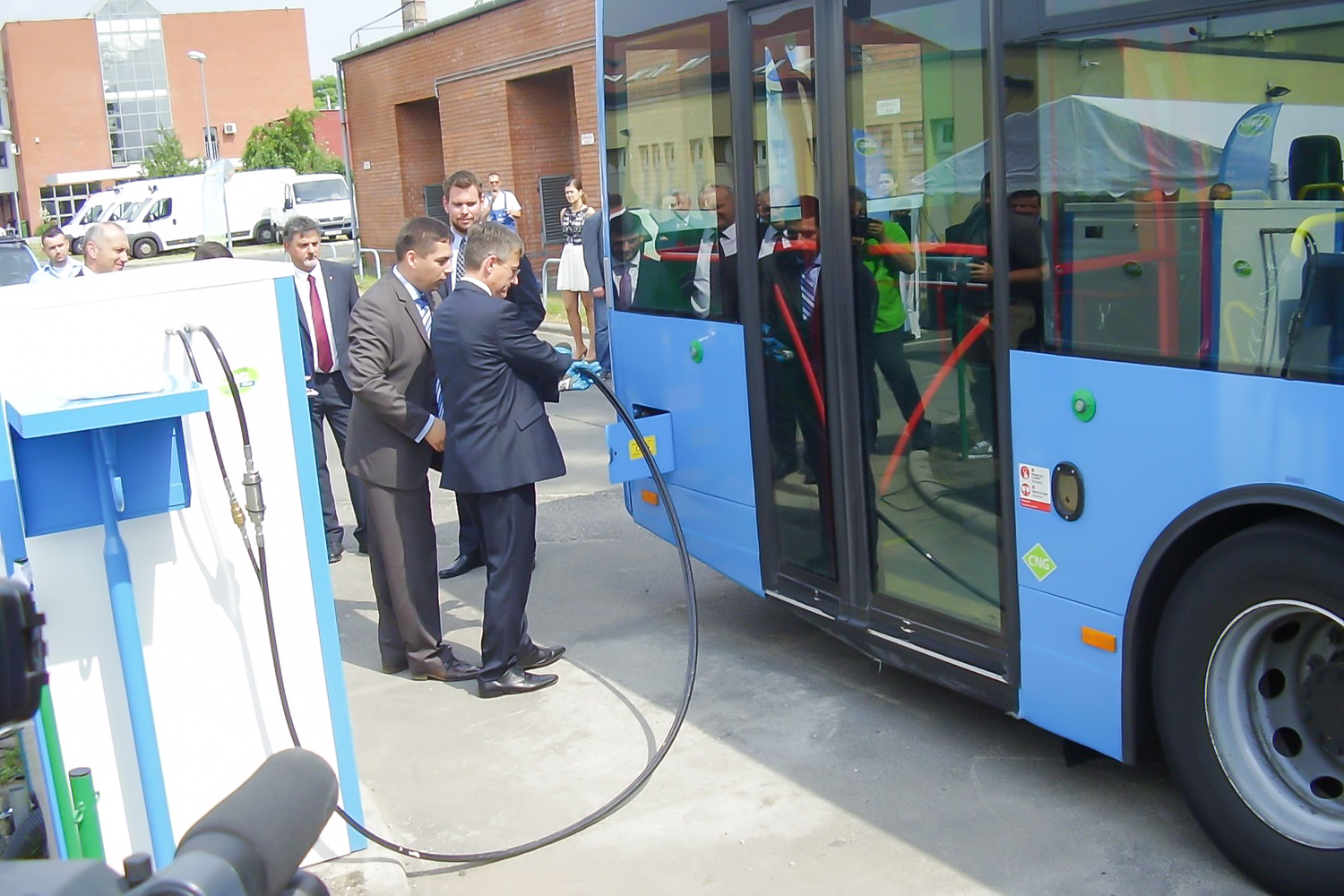 Volt olyan kolléga, aki stílusosan, egy teljesen elektromos Nissan Leaf tesztautóval érkezett a helyszínre, de a legtöbben a városon áthajtó különjárattal érkeztek. Az újságírókkal együtt az átadóban érdekelt cégek és közületek vezetői is buszoztak. Vitézy Dávidot, a BKK vezérigazgatóját így már menet közben kifaggattuk a CNG-buszokról. Tőle tudtam meg, hogy a 2010 őszén alapult BKK a fővárostól és a BKV-tól átvett szerepkörökben, a tömegközlekedési eszközök közül a jó ezer darab magaspadlós buszból már 500-at lecserélt. Vagy újakra, vagy a tizen-, sőt huszonéves Ikarusoknál fiatalabbakra, de mindenképpen környezetkímélőbbekre. A cél, hogy 2018-ra csak alacsonypadlós busz közlekedjen.