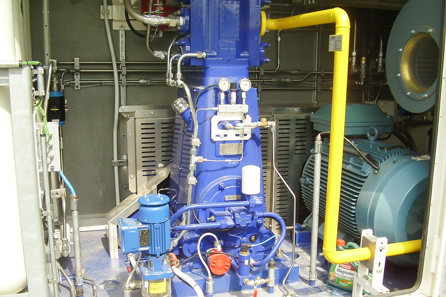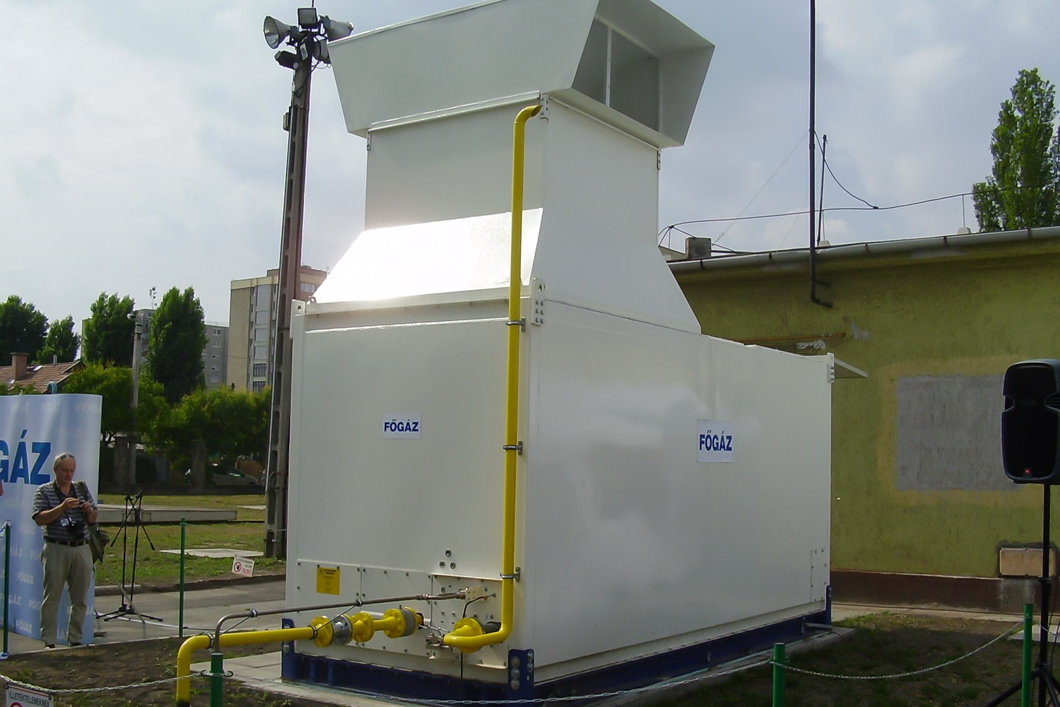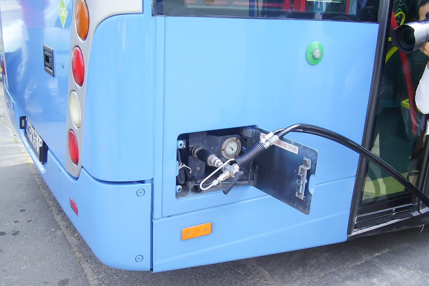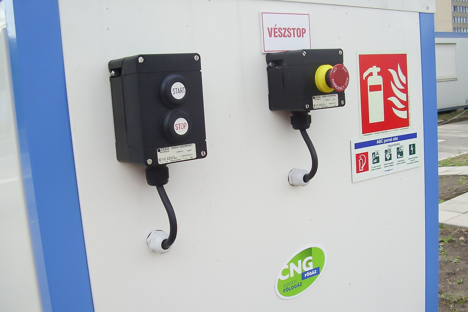 Balra a kútoszlop, jobbra az őt éltető nagy teljesítményű, 200 kW-os kompresszor. 1000 köbmétert tud átfejteni egy óra alatt, 230 baros nyomással. Bármilyen féllépő hiba esetén önműködően leáll a rendszer, tankolás közben a buszt sem lehet elindítani