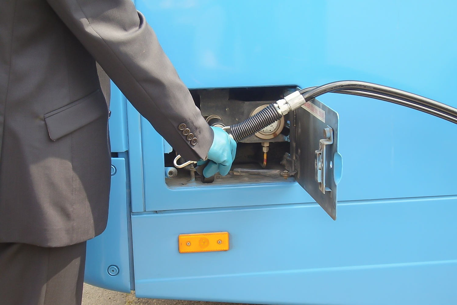 A Főgáz kabalafigurája integet a gáztelepre behajtó CNG-busznak. A Van Hool ablaktörő kalapácsaira nem az elektronika, hanem a sofőr vigyáz