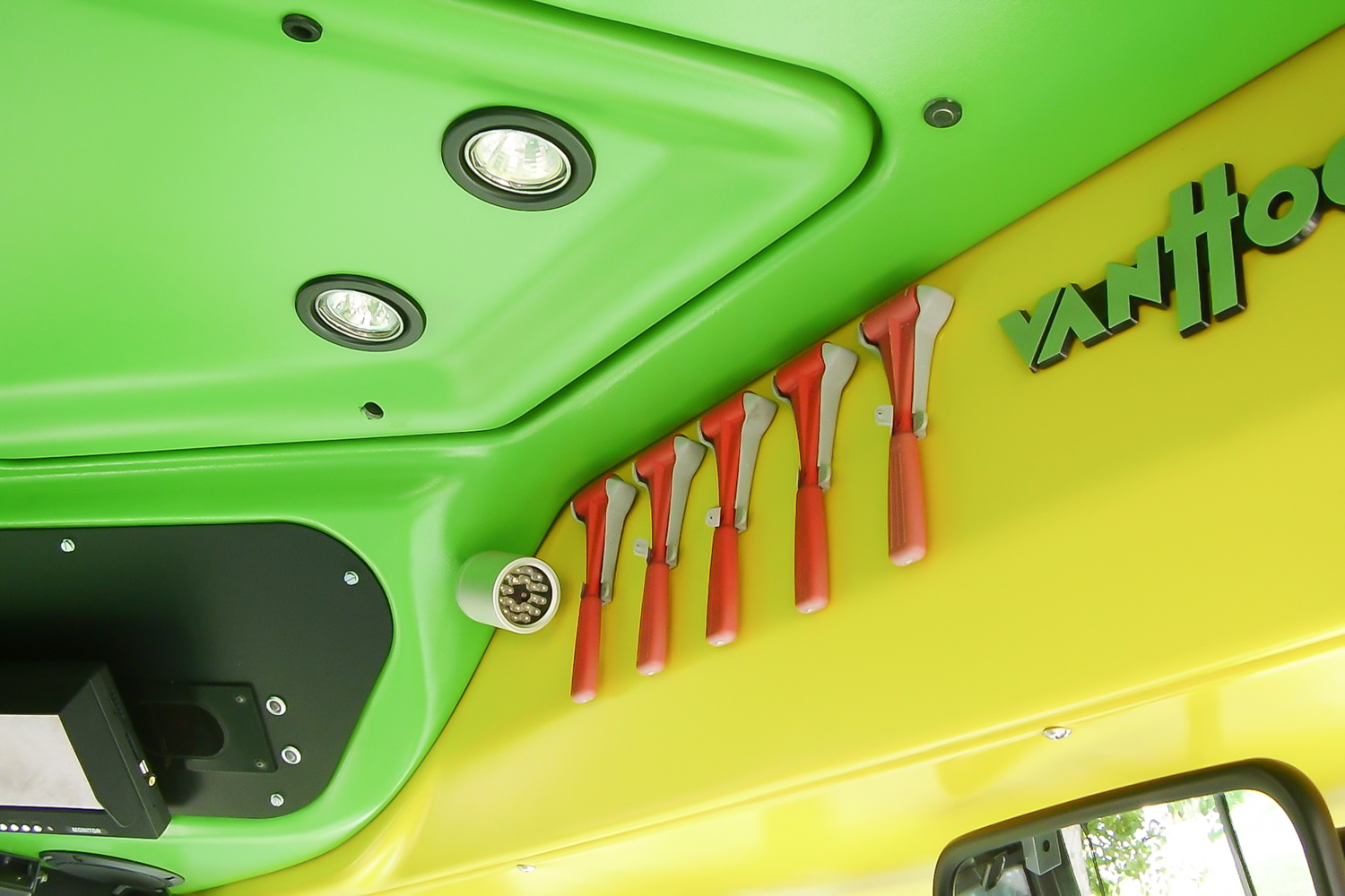 Beltere kicsit túl színes, de rendben van, az ülések kényelmesek. A motor nagyon sok helyet vesz el, mert nem állítva szerelték be