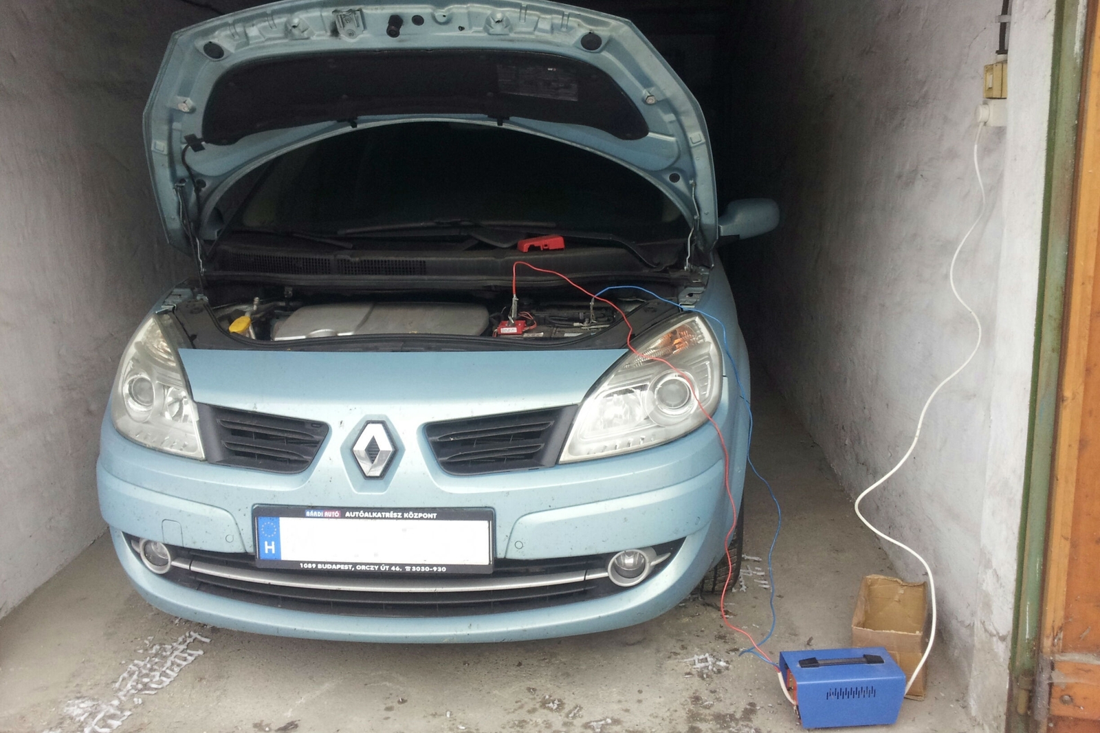 Némi fejvakarás, hogy hol férhetnénk el a forgalom zavarása nélkül a két autóval. Végül egy közeli parkolóudvar bejáratához betolatok a Merivával, az üresen is 1,75 tonnás Scénicet odamanőverezzük tologatással elé. Ismét jöhet a kábelezés, s végül a Scénic beindul. Kábelek le, probléma megoldva, és búcsúzóul meg is egyezünk, hogy akkor jöhet az új akkumulátor, nincs újabb kísérletezés a 2006-os gyárival.