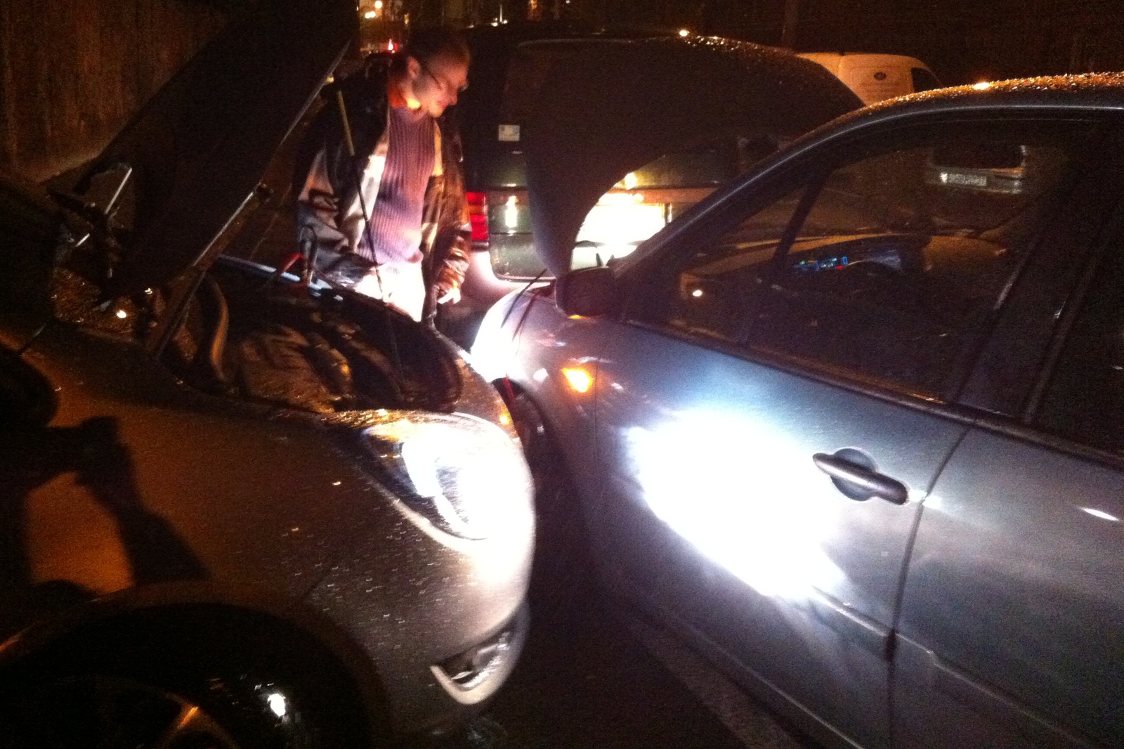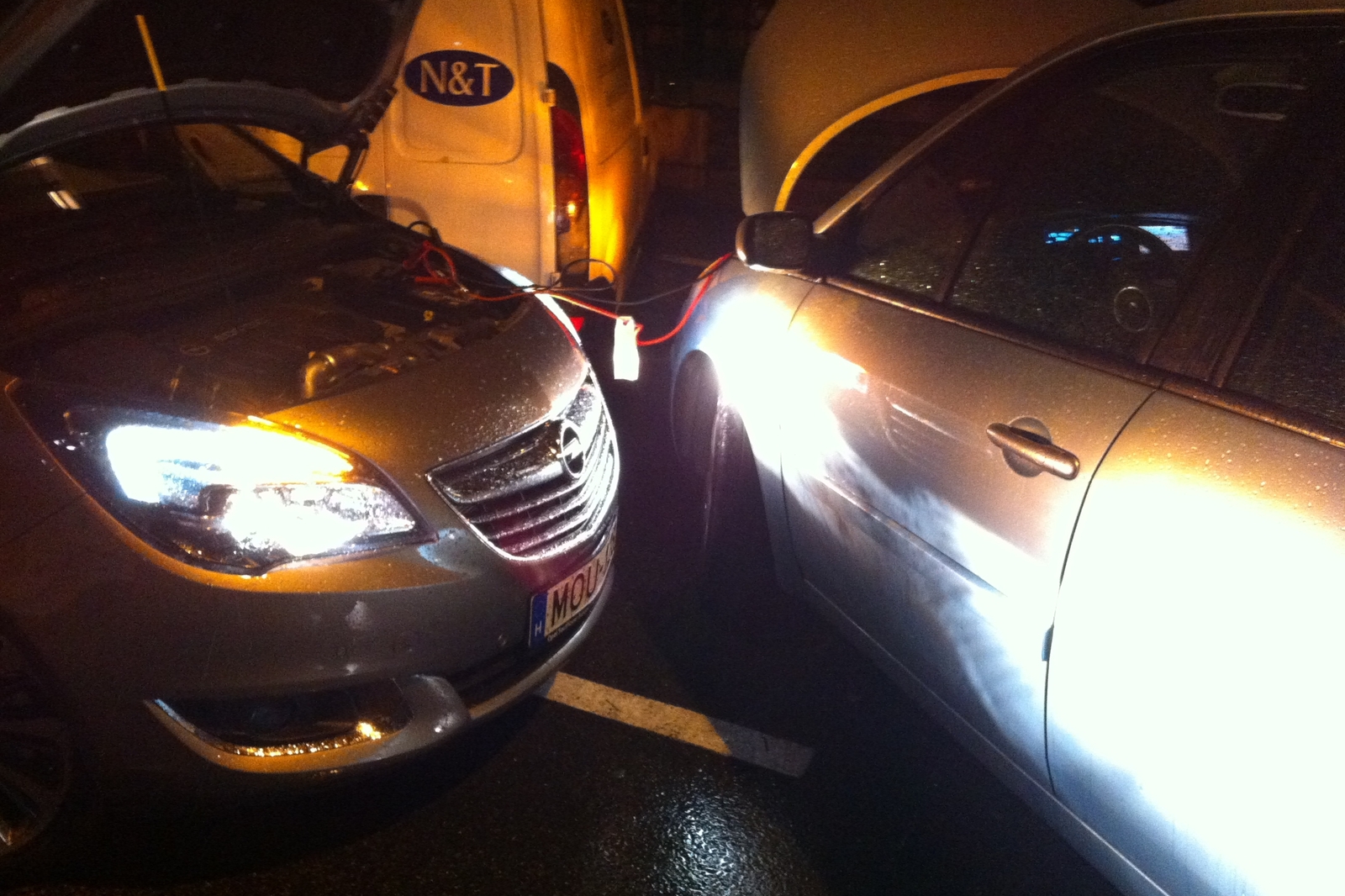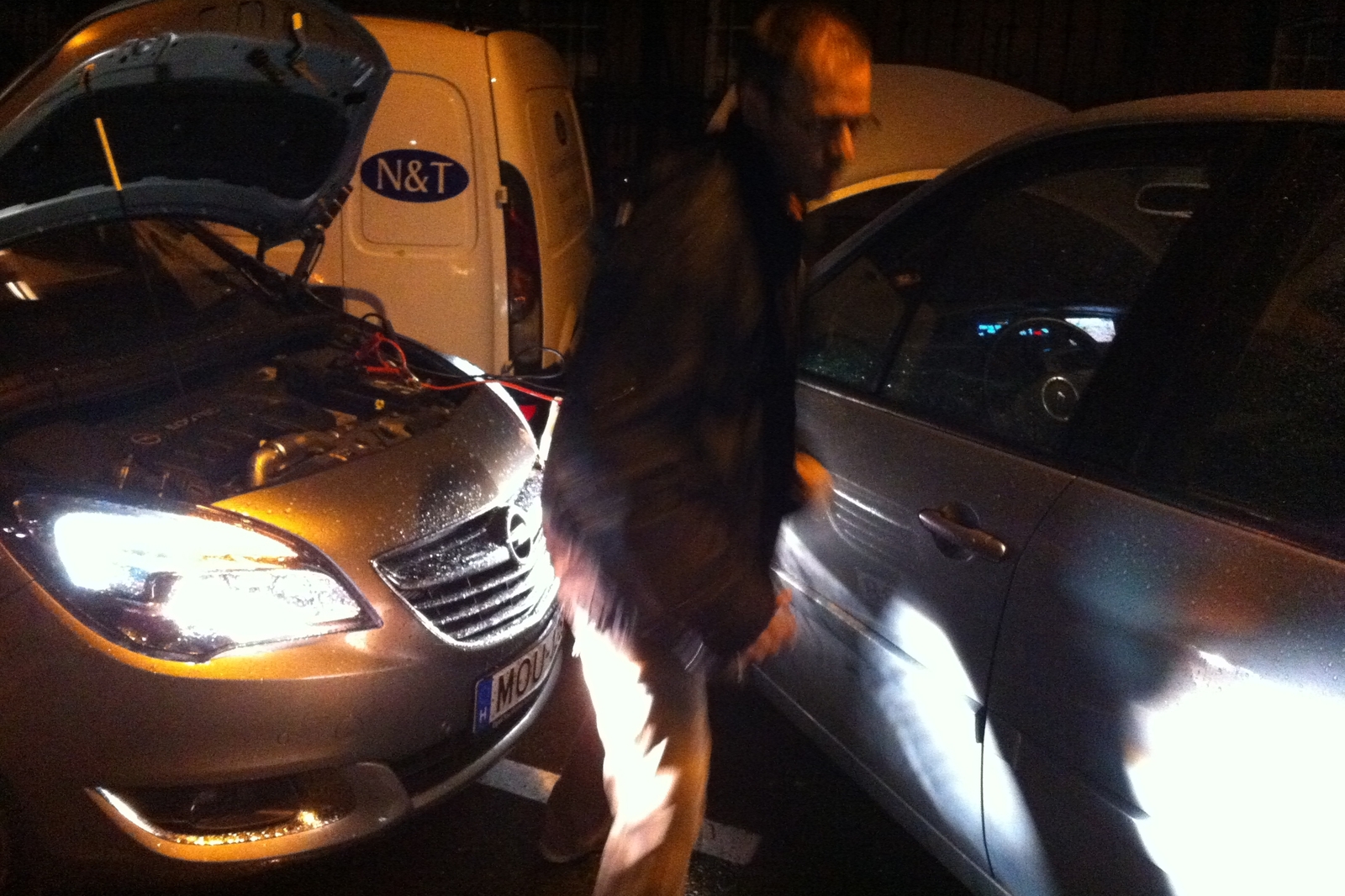 Megvárjuk, amíg épp nem jön egy autó sem az egysávos, egyirányú, amúgy trolibusz-útvonalnak is számító utcán, majd óvatosan leengedjük a Scénicet a járdáról. Úgy, hogy mögötte még elférjenek az autók, s mellé tudjak állni a Merivával a bikázáshoz. Mivel a Scénicben baloldalt van az akku, a forgalommal szembe kell forduljak. Manőverezésemkor épp jön egy mentő – szerencsére nem mentés, rohanás közben, így szerencsére türelmes is. Őt azért gyorsan elengedem, majd megállok úgy, hogy személyautók, furgonok is elférjenek mellettem. Bekötöm a kábeleket. Ugyebár az indító (Meriva) pozitív sarujáról először az indítandó (Scénic) pozitívjára, majd az indító negatívjáról az indítandó egy testpontjára kellene. De a sötétben testpontot nemigen találok, ezért az indítandó autónál is az akku negatívjára teszem a kábelvéget néhány sikertelen test-próbálkozás után. Éledezik a Scénic, de még nem indul. Közben jön egy troli, ami már nem fér el mögöttünk. Beljebb toljuk a Scénicet, a Merivával pedig beállok egy parkolóhelyre az utca másik oldalára.