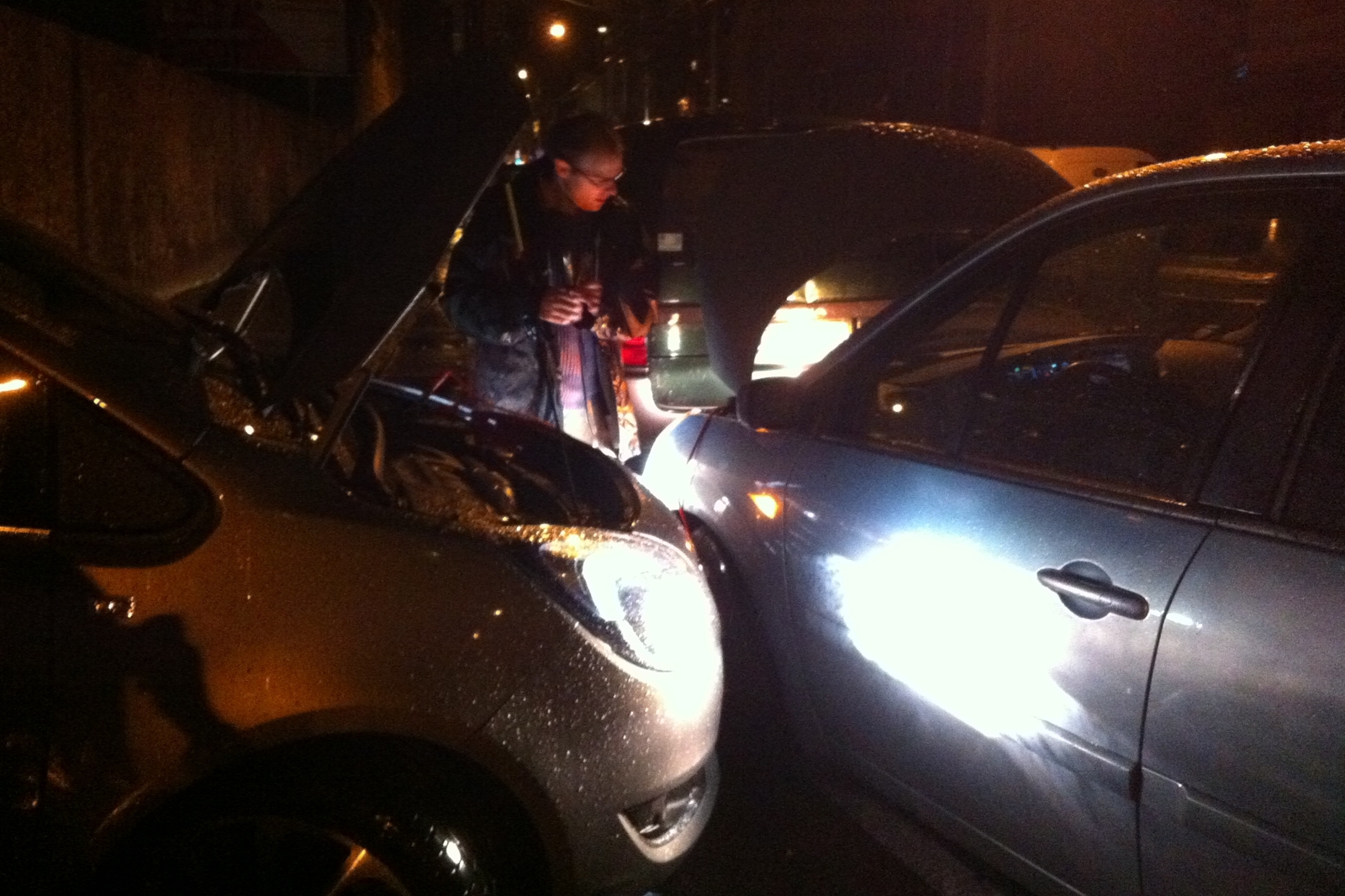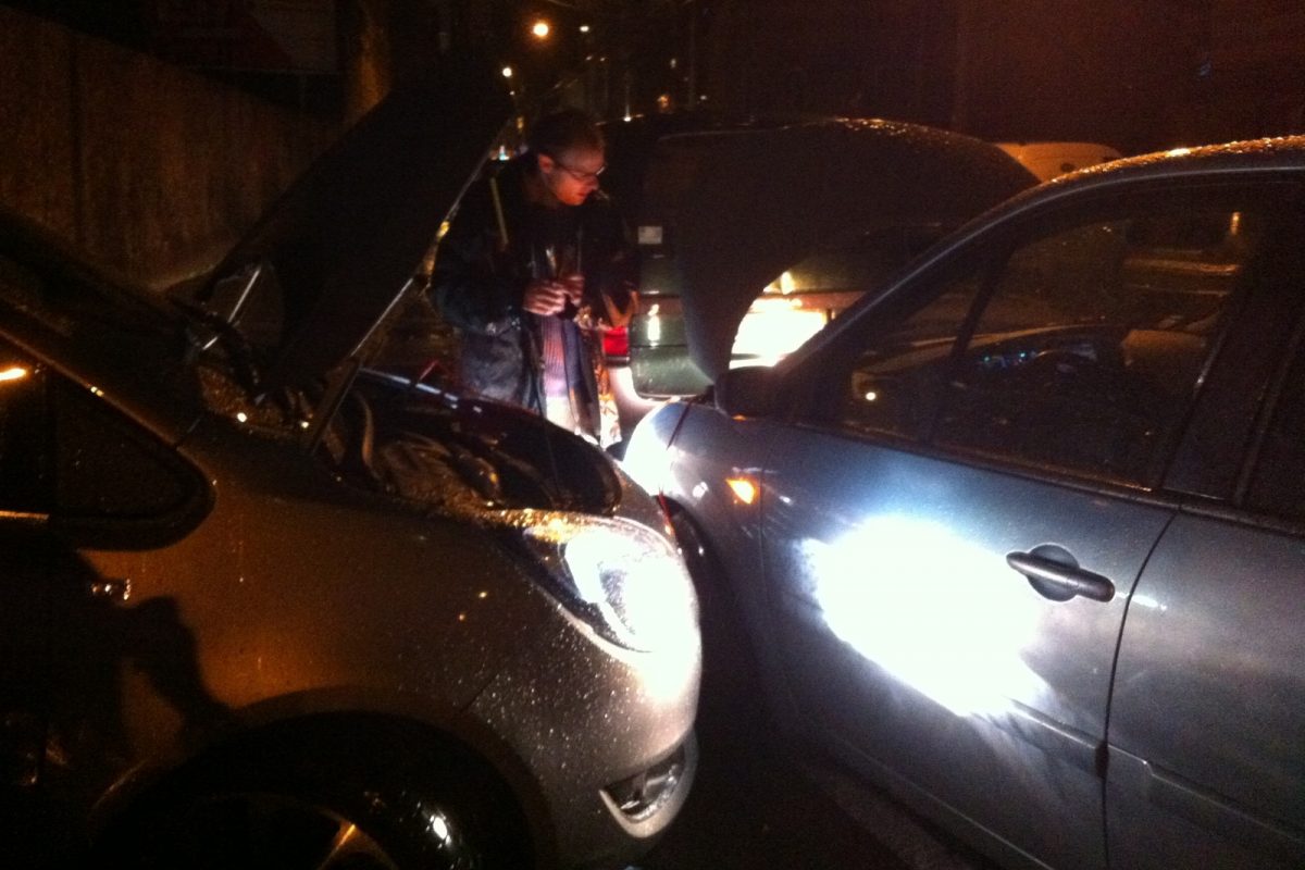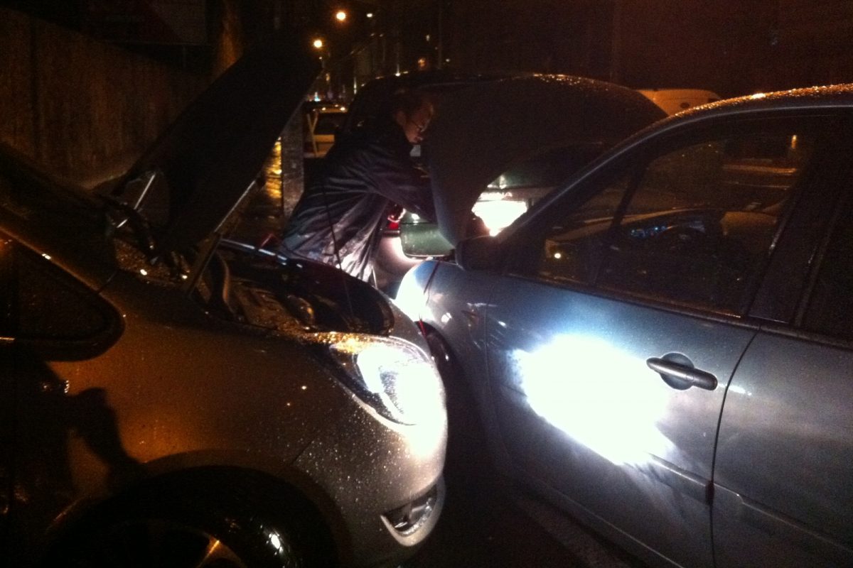 Megvárjuk, amíg épp nem jön egy autó sem az egysávos, egyirányú, amúgy trolibusz-útvonalnak is számító utcán, majd óvatosan leengedjük a Scénicet a járdáról. Úgy, hogy mögötte még elférjenek az autók, s mellé tudjak állni a Merivával a bikázáshoz. Mivel a Scénicben baloldalt van az akku, a forgalommal szembe kell forduljak. Manőverezésemkor épp jön egy mentő – szerencsére nem mentés, rohanás közben, így szerencsére türelmes is. Őt azért gyorsan elengedem, majd megállok úgy, hogy személyautók, furgonok is elférjenek mellettem. Bekötöm a kábeleket. Ugyebár az indító (Meriva) pozitív sarujáról először az indítandó (Scénic) pozitívjára, majd az indító negatívjáról az indítandó egy testpontjára kellene. De a sötétben testpontot nemigen találok, ezért az indítandó autónál is az akku negatívjára teszem a kábelvéget néhány sikertelen test-próbálkozás után. Éledezik a Scénic, de még nem indul. Közben jön egy troli, ami már nem fér el mögöttünk. Beljebb toljuk a Scénicet, a Merivával pedig beállok egy parkolóhelyre az utca másik oldalára.