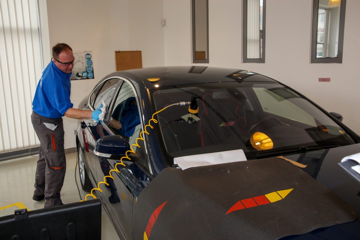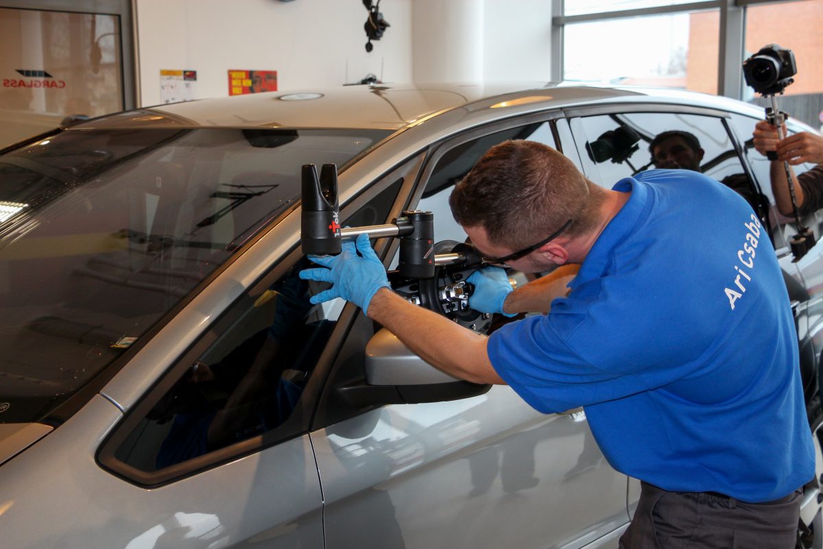 Bravúros, de a Carglass eszközeivel akár a képen látható Ford S-MAX hatalmas szélvédője is egyetlen ember által cserélhető. Az oldalablakokra tett tappancsokkal hajtható helyére az új, már ragasztóval bekent üveg. A karosszériára egy aktivátor anyag kerül, szükség esetén rozsdamentesítés és festés is szükséges lehet