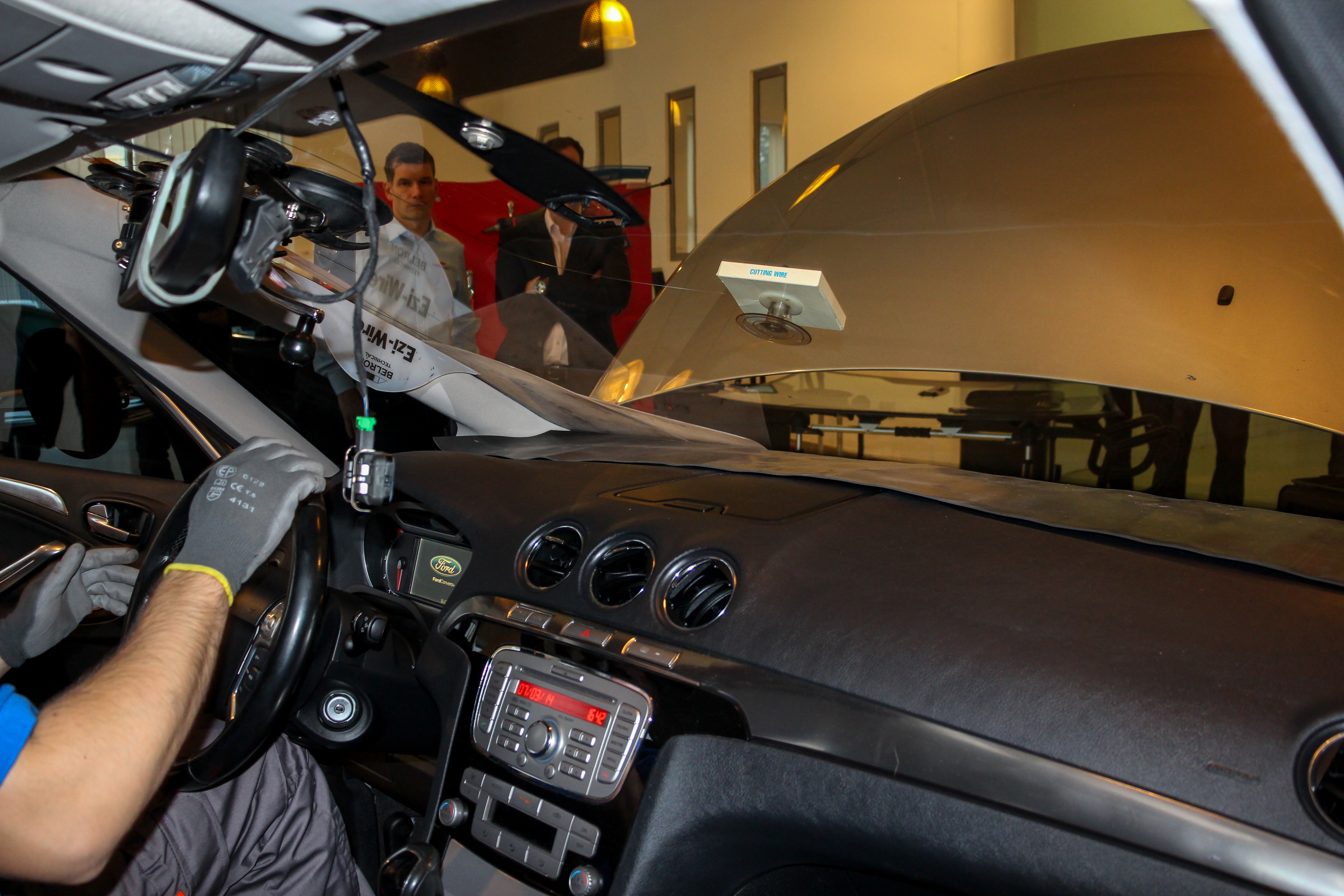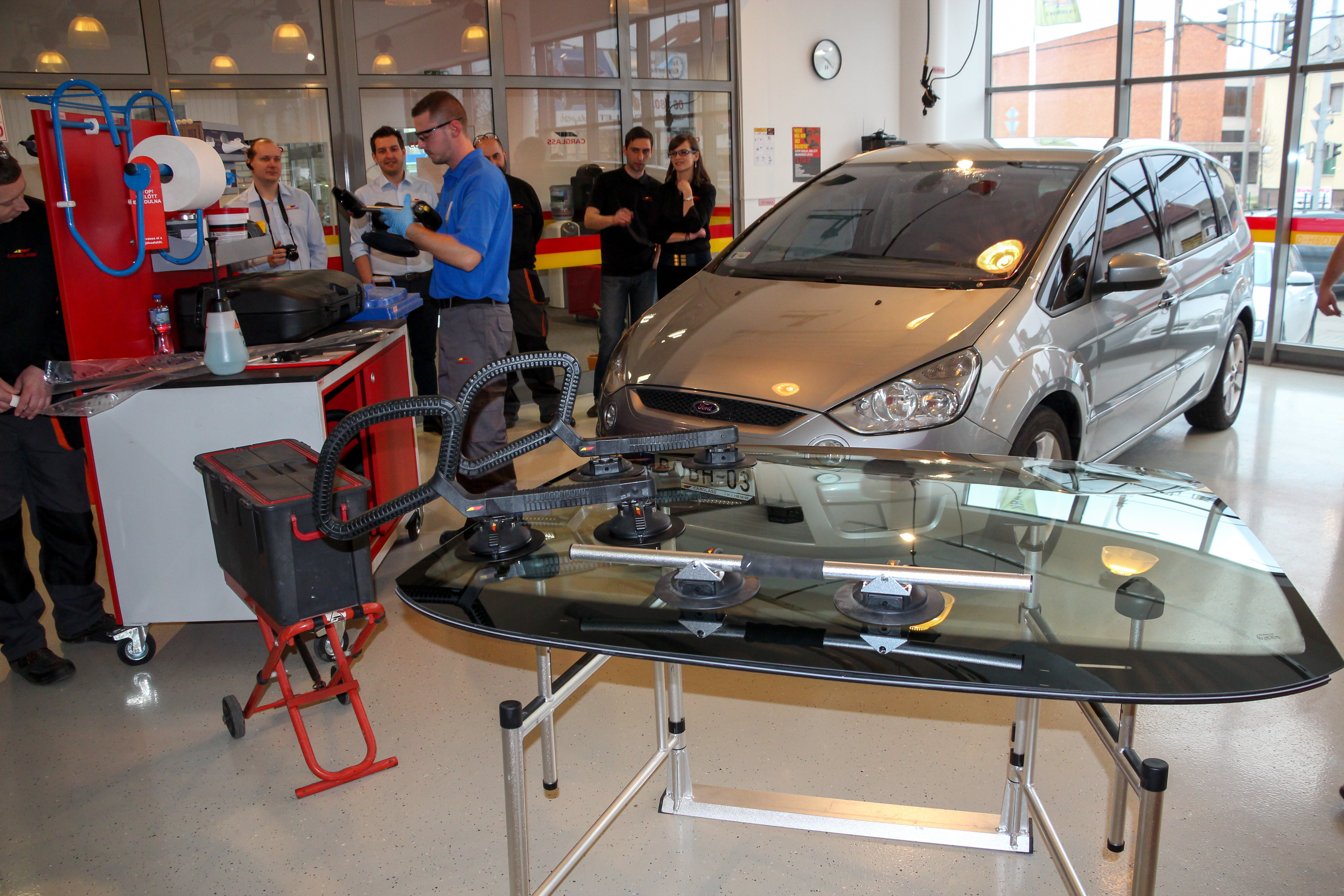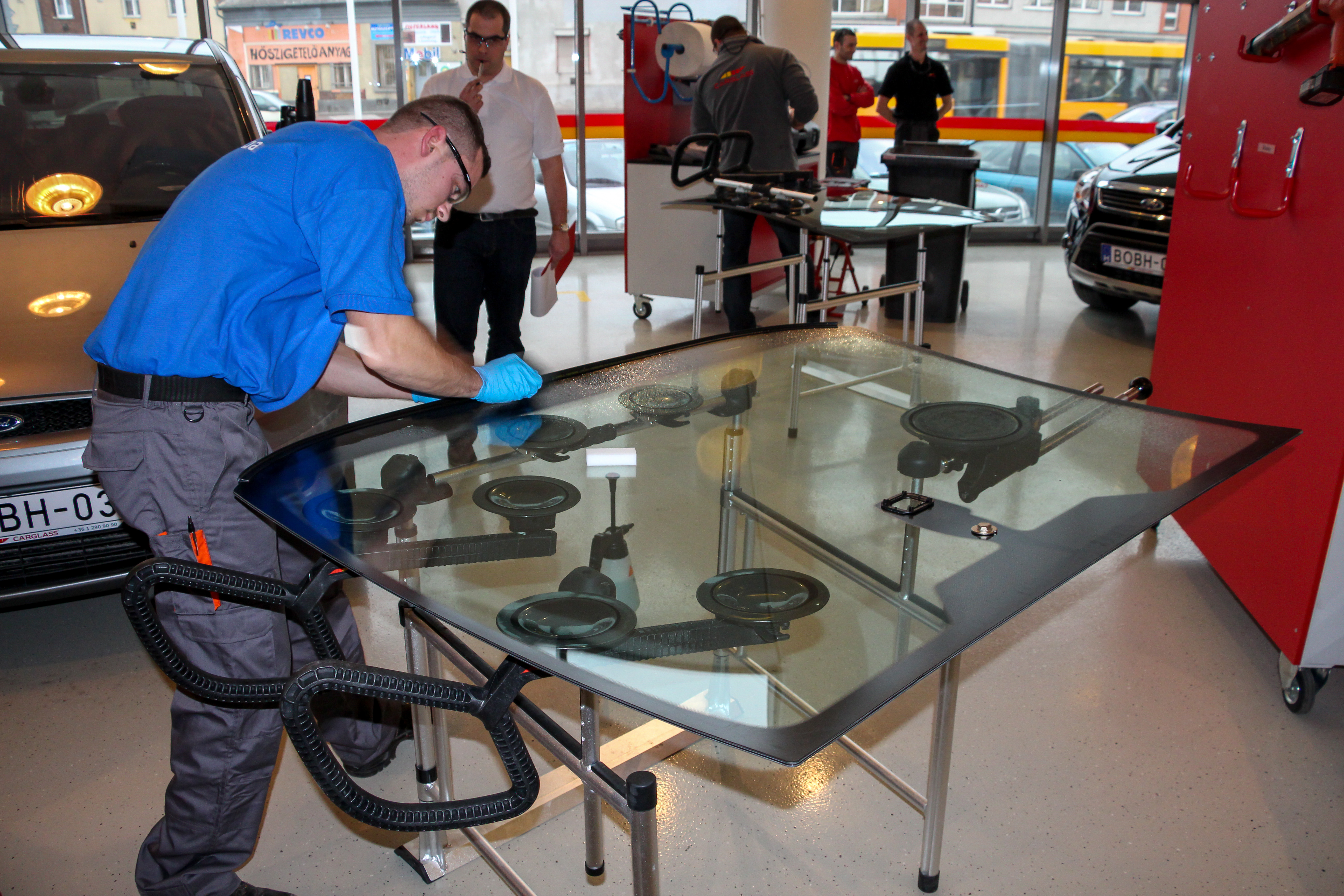 Bravúros, de a Carglass eszközeivel akár a képen látható Ford S-MAX hatalmas szélvédője is egyetlen ember által cserélhető. Az oldalablakokra tett tappancsokkal hajtható helyére az új, már ragasztóval bekent üveg. A karosszériára egy aktivátor anyag kerül, szükség esetén rozsdamentesítés és festés is szükséges lehet