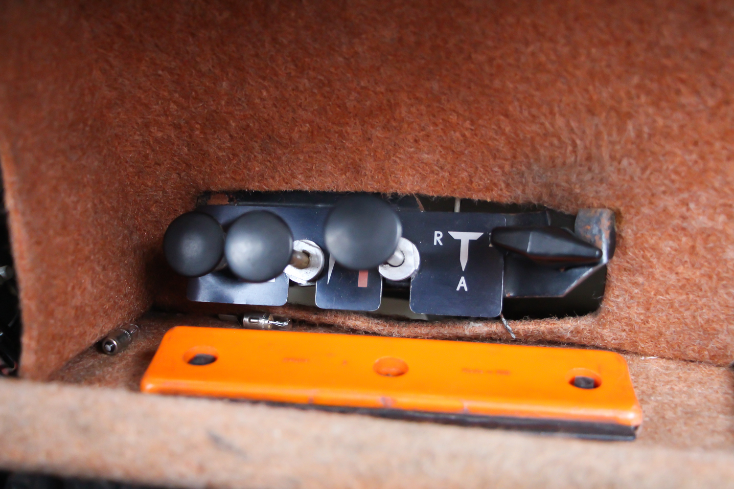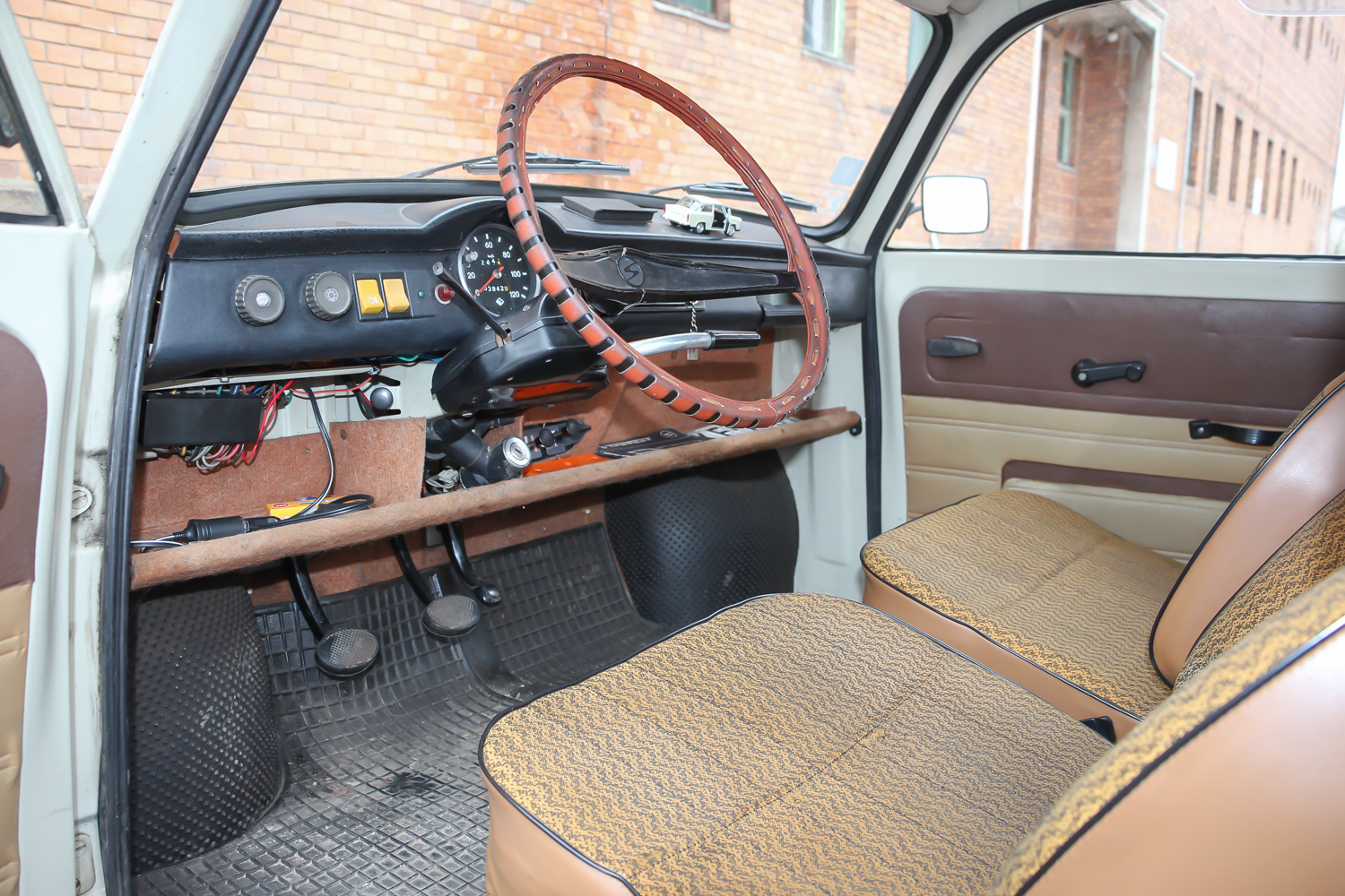 Korabeli a valódi bőrburkolat a kormányon, a bakelitkarima repedése meg típussajátosság. Látják azt a kis bibircsókot a lábtér közepén? Na, az a gázpedál, amit akár az anyós is taposhat. A belógó doblemezek miatt csak így tudták megoldani a padálok elhelyezését