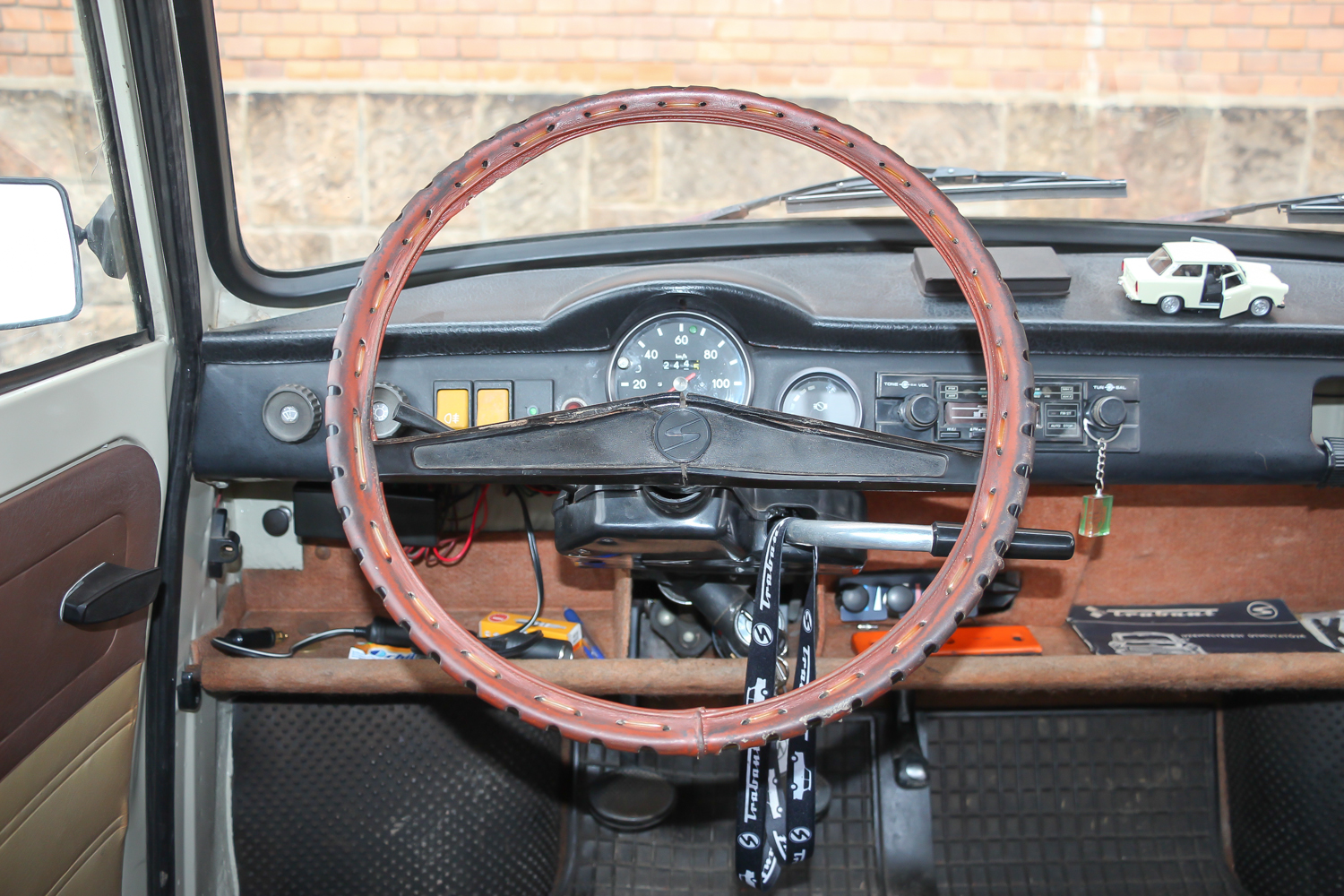 Korábbi cikkünkben a típus történetét alaposan kiveséztük, így én most csak annyit tennék hozzá, hogy ez a példány az utolsószériás kétütemű, azaz a „legmodernebb kiadás. A Trabant-szűz sofőrnek azért így is kell egy rövid használati utasítás a gépsárkány beüzemeléséhez. Autóhoz odalép, kinyit, beül, helyet foglal – eddig ment nekem is egyedül. Aztán jön a kormány alatti polcon elhelyezett benzincsap kinyitása, így az ejtőtank enged már naftát a karburátorba. Indítózunk, kis gázzal besegítünk esetleg és indulnánk, na de hol az egyes? Egy filigrán, bakelitvégű alumínium esernyőnyél a váltókar, amit egy valaha Trabanttal ralizott kollégánk el is tört többször. Úrvezetőknél ilyen nem fordulhat elő, mert a szerkezet ha nem kopott, két ujjal simán kapcsolható. Megvan a H séma, csak el van forgatva balra és az egyes síkja van távolabb a vezetőtől.