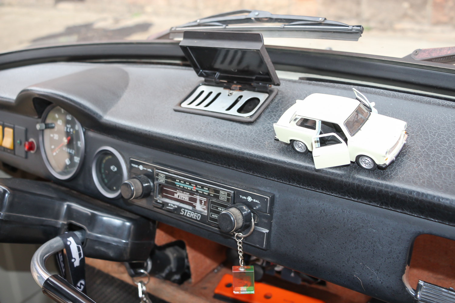 Hamutartó és dekor Trabi a műszerfal tetején. A gumiszőnyegszett nem gyári, hanem korabeli kisipari darab. Jutott előre már biztonsági öv is, a hátra beszállás meg csakis támladöntéssel megy, nem a legkényelmesebb, de megteszi