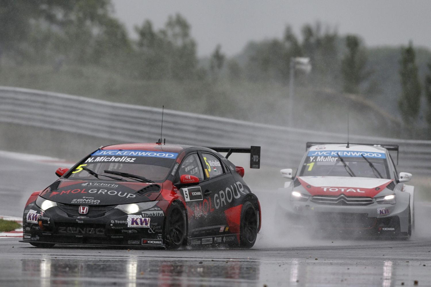 Legjobb hondásként Michelisz a címvédő előtt. Müller kiugrott a rajtnál, amiért megbüntették, így se visszaelőzni, se kilökni nem tudta Norbit (képek: fiawtcc.com)