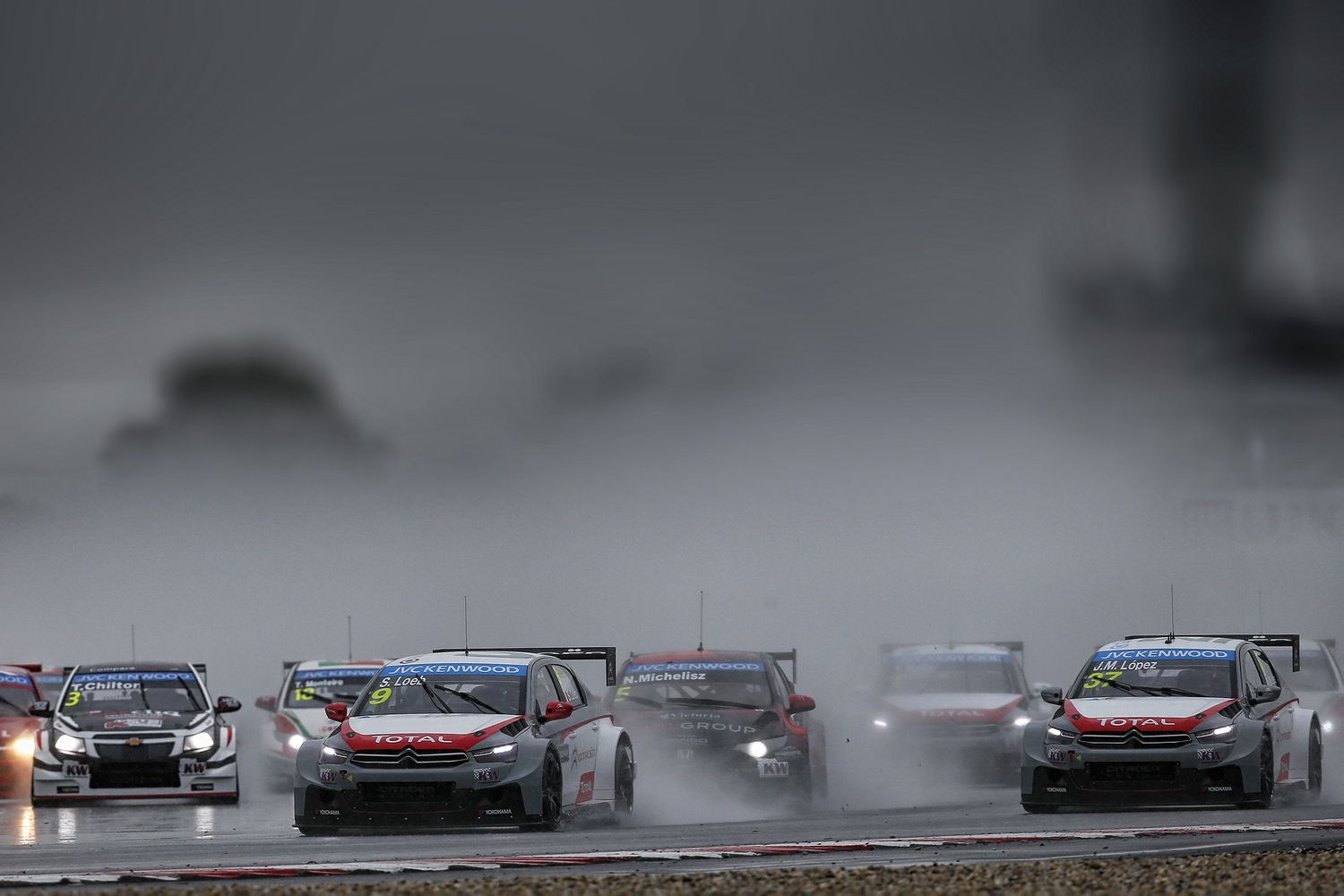 Az első és egyetlen verseny startját követő tömegjelenet: Loeb lerajtolta Lópezt, akit kis híján Michelisz is meg tudott előzni. Annyi víz volt a pályán, hogy az esőgumikon is csak csúszkáltak az autók, és a látási viszonyok sem voltak épp ideálisak