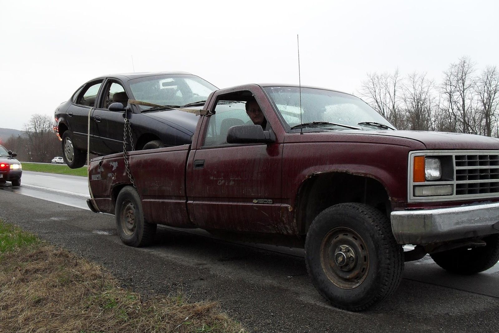 A pickup vezetője nyilván nem sajnálta a lehasznált Chevyt, de ahogy a képeken látszik, a passzív Fordot sem, mert ahogy rá lett rakva a platóra, feltehetőleg az is sérült. A túlterhelt Chevy talán túlélte váztörés nélkül, de minimum behorpadt, a ki tudja, miért nem saját lábon közlekedő Ford meg az első futóművén támaszkodik, az sem túl egészséges. A legrosszabb az lett volna, ha valamiért a redneck szállítmánynak ebben a pózban kellett volna egy hirtelen kikerülési manővert vagy egy vészfékezést végrehajtania. Szerencsére idáig nem jutottak el, időben lefülelték őket.