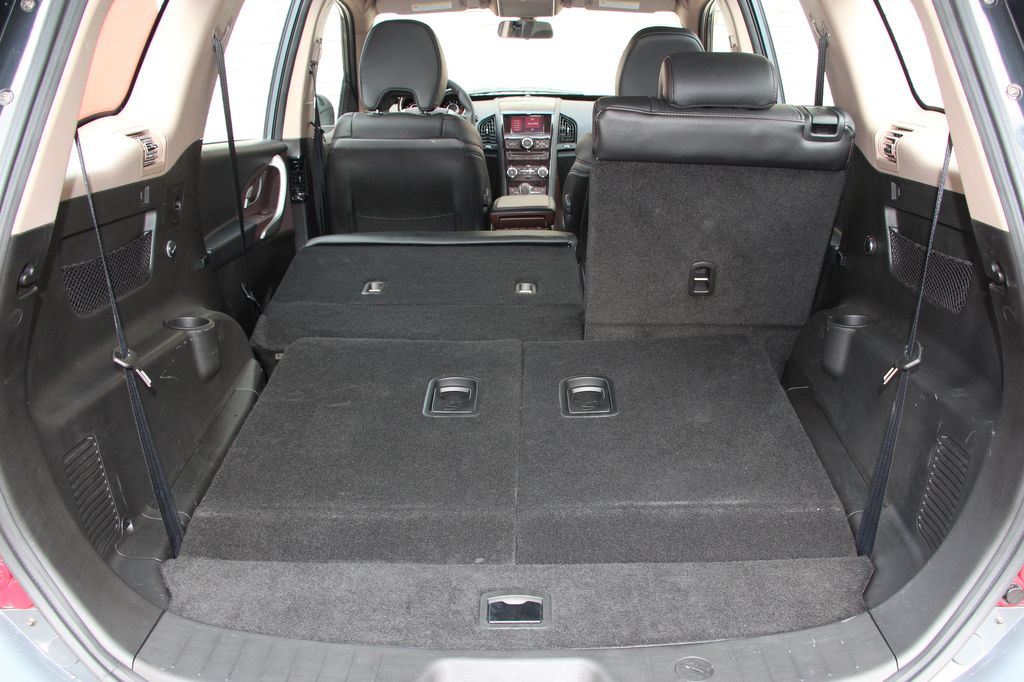 Szögezzük le, hogy a XUV500-zal nem az a baj, hogy olcsó autó, hanem az, hogy nem akar annak tűnni, prémiumosnak kíván látszani. Ha az üléseken nem kellemetlen bőr, hanem szövetkárpit lenne, ha a középkonzolt nem borítaná fát mintázni próbáló műanyag, ha minden azt sugallaná, hogy olcsó autóban ülünk (ami igaz is), akkor talán rajongani is lehetne érte. Hátsó lábtere ugyanis sík, még leghátsó sorában is egészen jól el lehet férni, ami a nem egész 4,6 méteres autónál nagy szó. A leghátsó székeket a padlóba döntve ráadásul igen nagy, 700 literes – kalaptartóval sajnos nem fedhető – a csomagtér, bővítéséhez pedig a középső sor székei is síkba fektethetők.