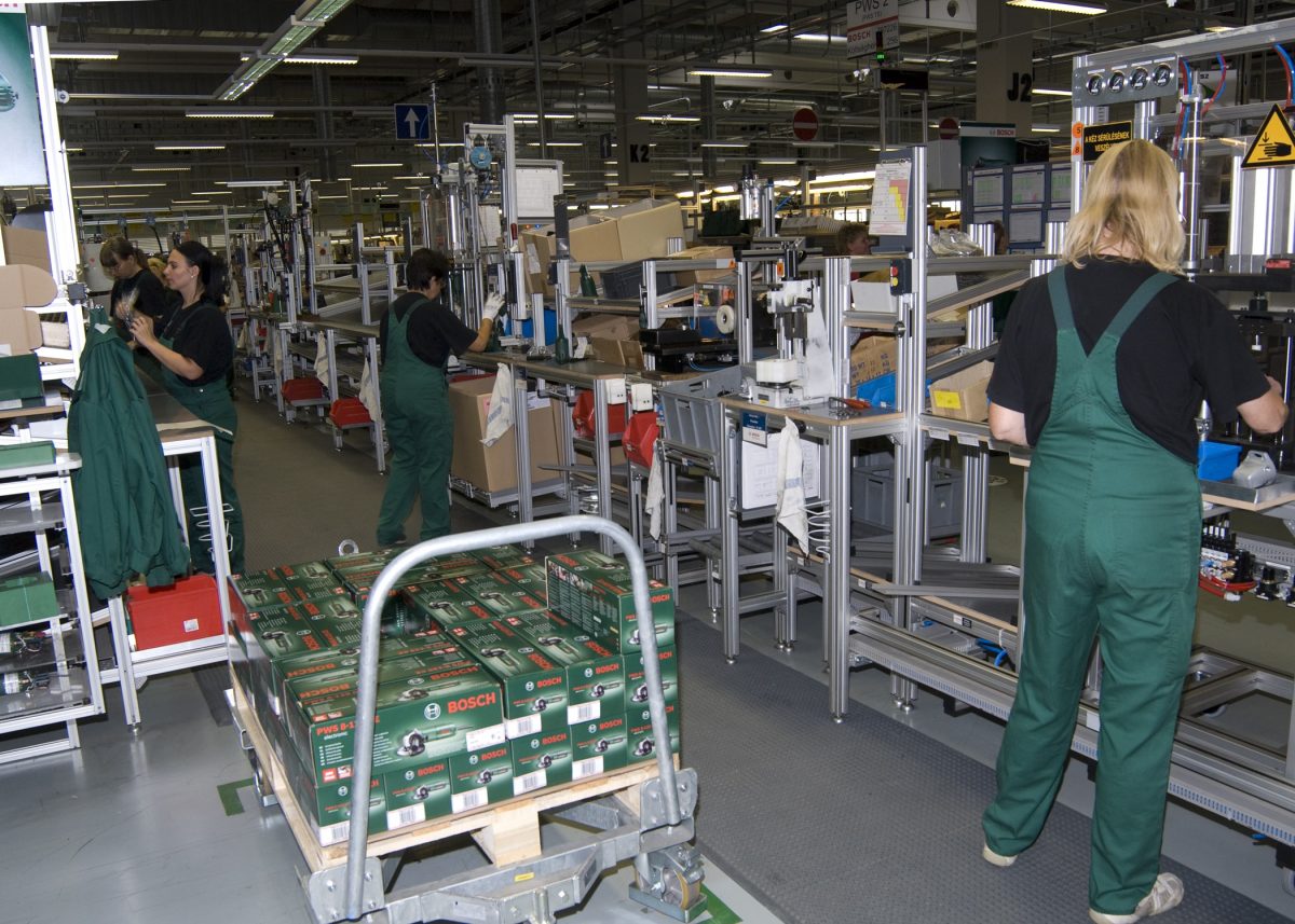 Miskolcon a Bosch Power Tool Kft. készít szerszámokat, a raklapon egy adag flex