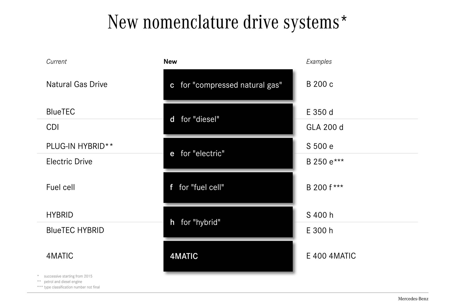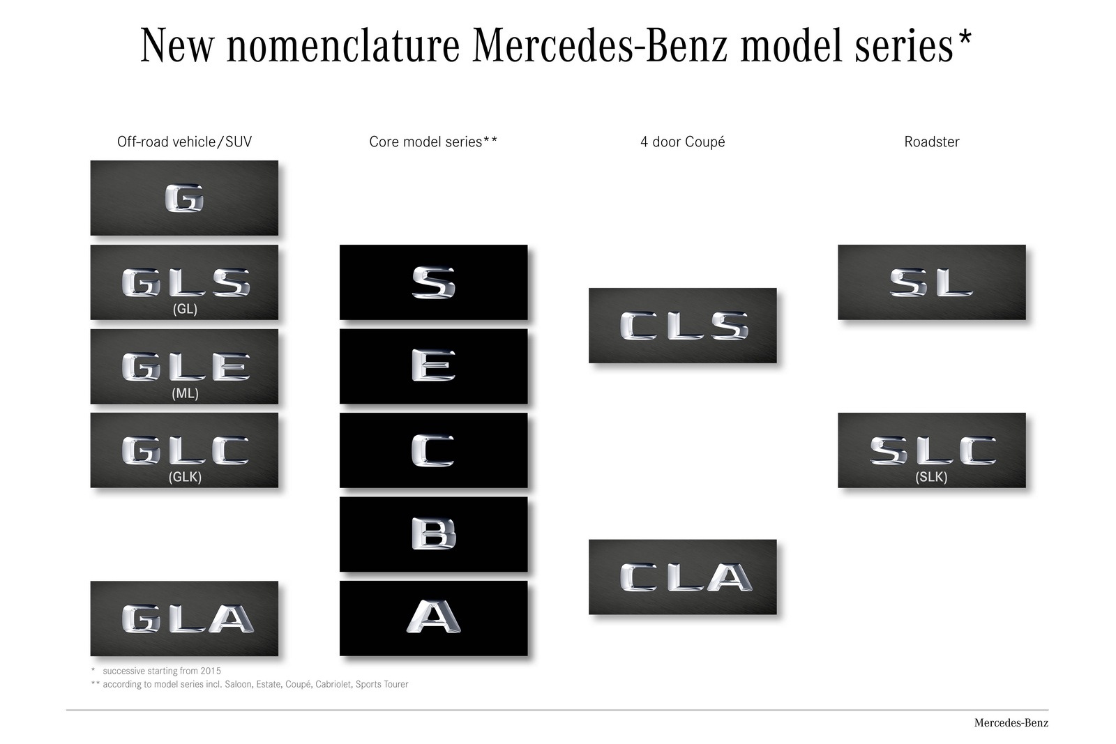Van persze olyan, ami nem változik, az A, B, C, E és S osztályokból álló sor adja a kínálat vázát. Terepjárófronton az alapkoncepcióját tekintve 1979 óta változatlan G-osztályt sem bolygatják, tiszteletből megtartja nevét. Az 1997-ben bemutatott ML-lel kezdődő SUV széria viszont új nevet kap. Mind hárombetűs lesz és GL-lel kezdődik. G, mint németül terepjáró, aztán egy L, mint mondják a kiejtés könnyítésére. A harmadik betű azt jelöli, hogy a SUV technikailag melyik földszintes alapmodellhez áll közel. Ez a névkérdés a GLA bemutatásakor már megvolt a Mercinél, most úgy döntöttek átnevezik a már régebb óta futó típusokat. A következő generációs GLK neve így GLC lesz, az ML meg GLE, a GL neve meg GLS-re változik.