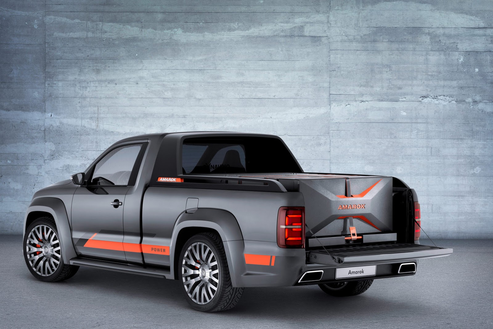 Az Amarok Power Concept utasterébe is jócskán kapott narancssárga berakásokat, meg persze karbon(szerű) borítást. Váltója nyolcfokozatú automata, motorja a legújabb 3,0 literes V6-os TDI – 272 lóerővel és 600 Nm nyomatékkal. Ez 7,9 másodperc alatt viszi 100 km/órás tempóig az 5,25 méter hosszú monstrumot.